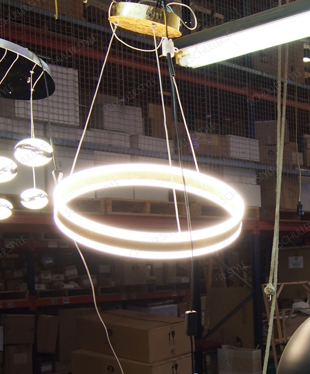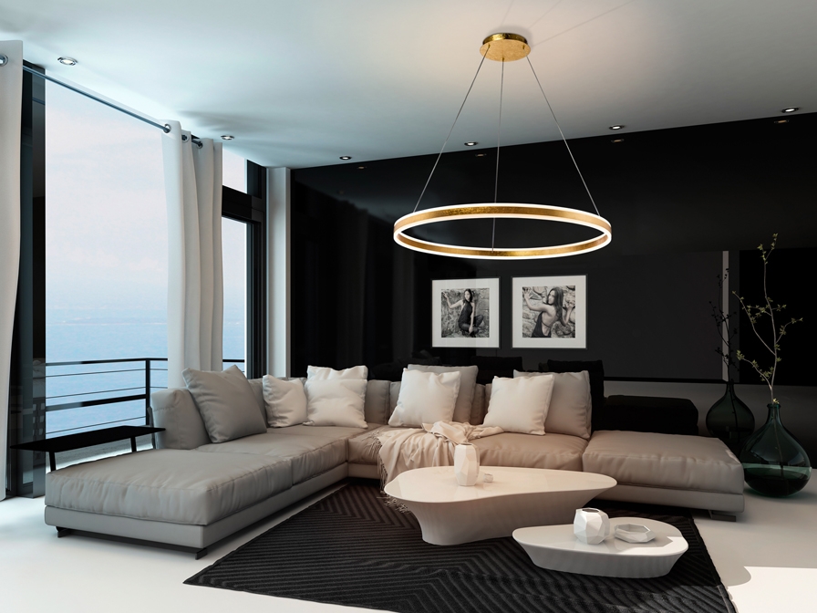 Подвесной led светильник из современной коллекции Helia с основанием из металла и алюминия с эффектным покрытием золотой фольгой. Плафон сделан в виде большого обруча с акриловым рассеивателем матового, опалового цвета. Высота подвешивания люстры регулируется по необходимости. 110W LED, 6600 Lm, 3000 K.