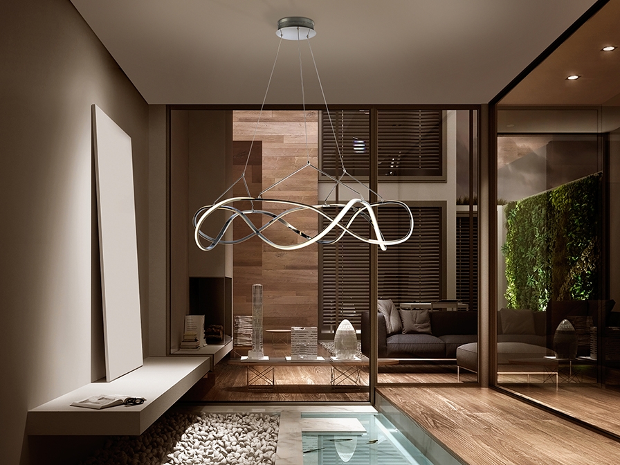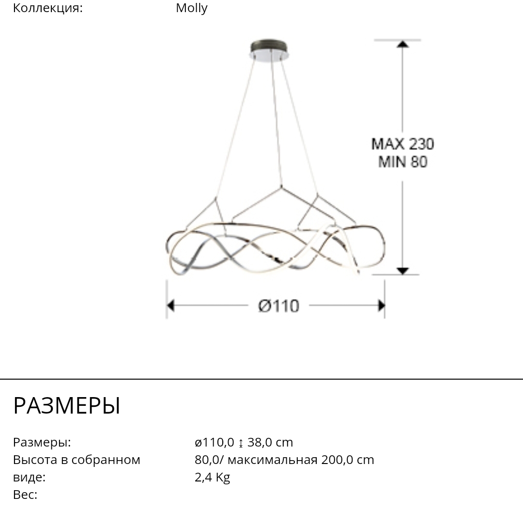 Коллекция интересных подвесных светодиодных светильников из коллекции Molly пополнилась еще одной большой моделью диаметром 110 см. Каркас люстры сделан из легкого алюминия с глянцевым покрытием "хром". Силиконовый рассеиватель опалового цвета закреплен по всему контуру волнообразного абажура. Высота подвешивания регулируется от 80 см до 230 см. Люстрой удобно управлять с пульта дистанционного управления после обновления артикула 763585D. Световой поток: 63W LED, 5670 Lm, теплый свет 3000 K. LED драйвер TRIAC 0-10V. Возможно использование с настенным диммером 0-10V. Средний срок службы светильника рассчитан на 50000 часов.