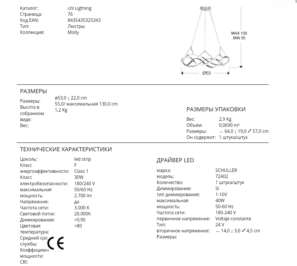 Современная геометрия причудливых форм нашла выражение в коллекции дизайнерских светодиодных светильников Molly фабрики Schuller. Каркас люстры с регулируемой высотой подвешивания изготовлен из алюминия в модной глянцевой отделке "хром". По контуру плафона, повторяя все фигурные линии, идет световой акриловый дуффузор опалового цвета. Купить светильники Schuller из последних выпускаемых фабрикой коллекций можно в нашем интернет-магазине с быстрой доставкой в Москве либо отправкой по России при необходимости. Средний срок службы рассчитан на 50 000 часов.