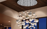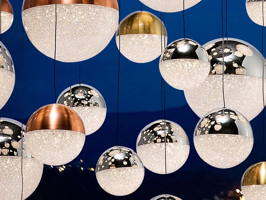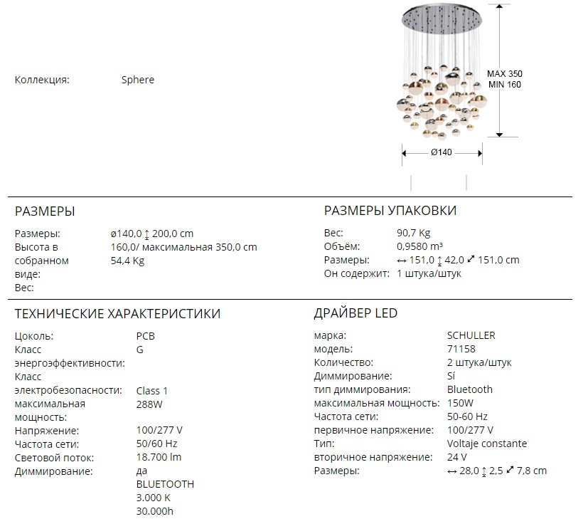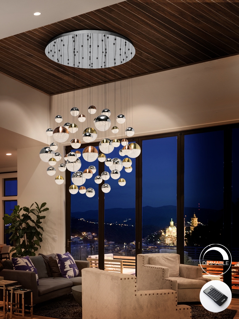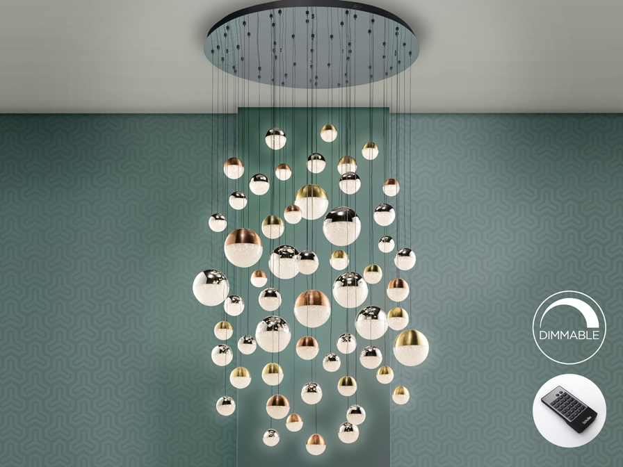 Красивая, впечатляющая дизайнерская модель большого потолочного светильника- каскада Sphere от фабрики Schuller на 55 плафонов -шаров диаметрами Ø10 cм, Ø12 cм, Ø20 cм с разноцветной отделкой металла: "медь", "глянцевый хром" и "латунь" . Габариты и высота подвешивания 350см позволяют оформить этой моделью люстры ресторан, коттедж, торговый центр с высоким потолком. Декоративный вид плафонов- шаров в выключенном состоянии после включения мгновенно преобразуется сиянием, становясь привлекающим внимание арт-объектом в интерьере. Шары выполнены из фактурного поликарбоната. Высота прозрачного кабеля у каждого плафона регулируется по необходимости. Люстра включает светодиодный драйвер с функциями затемнения Bluetooth для использования с мобильным приложением или планшетом. Его также можно использовать с интеллектуальным динамиком, таким как Google Home или Amazon Echo, если добавлено устройство шлюза Bluetooth. Он не совместим с настенным диммером. Купить большую люстру и другие светильники из коллекции Sphere можно круглосуточно в нашем интернет- магазине с оперативной доставкой от фабрики Schuller.