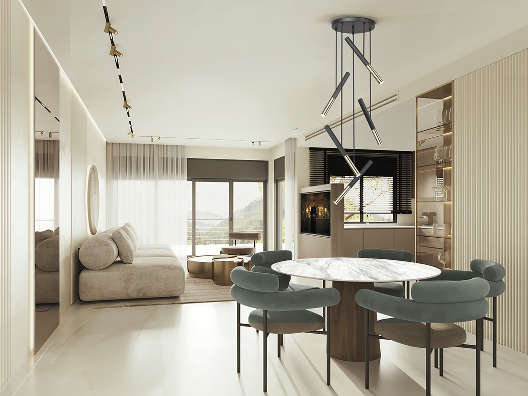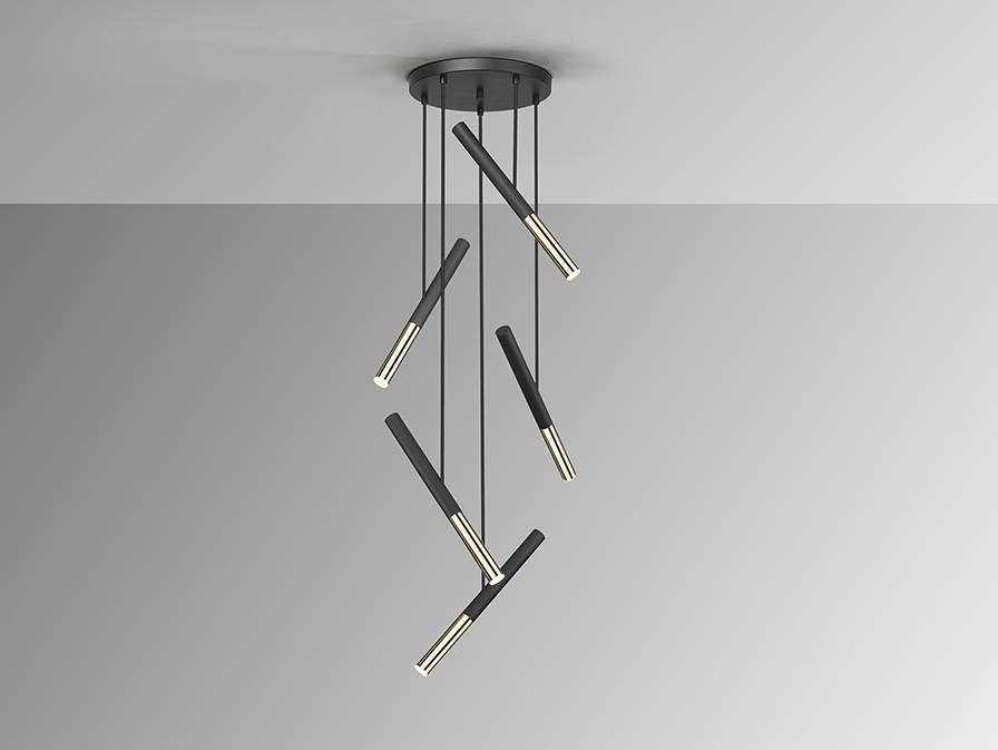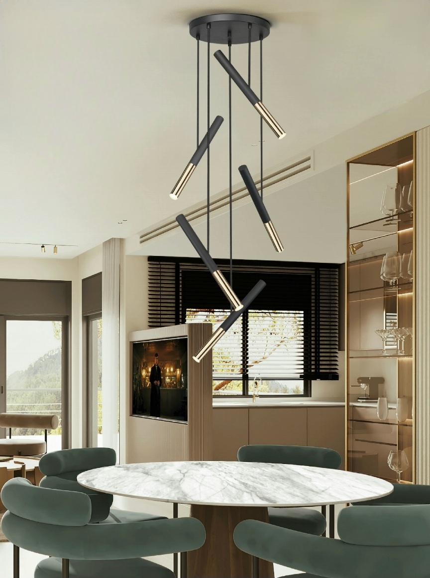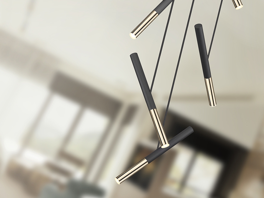 Современная геометрия- стильный светодиодный светильник Edna от испанской фабрики Schuller с пятью подвесами трубками с наклонами в разном направлении. Высоту каждого можно отрегулировать до 2 м. Основание металлическое с чёрной матовой отделкой. Как изысканный акцент используется золотой глянец на нижних частях плафонов. Необычная модель 2023 года, которая расширяет площадь направленного освещения в сравнении с прямыми вариантами подобных люстр. Световой поток: 25 led, 2250 Lm, теплый свет 3000К.
