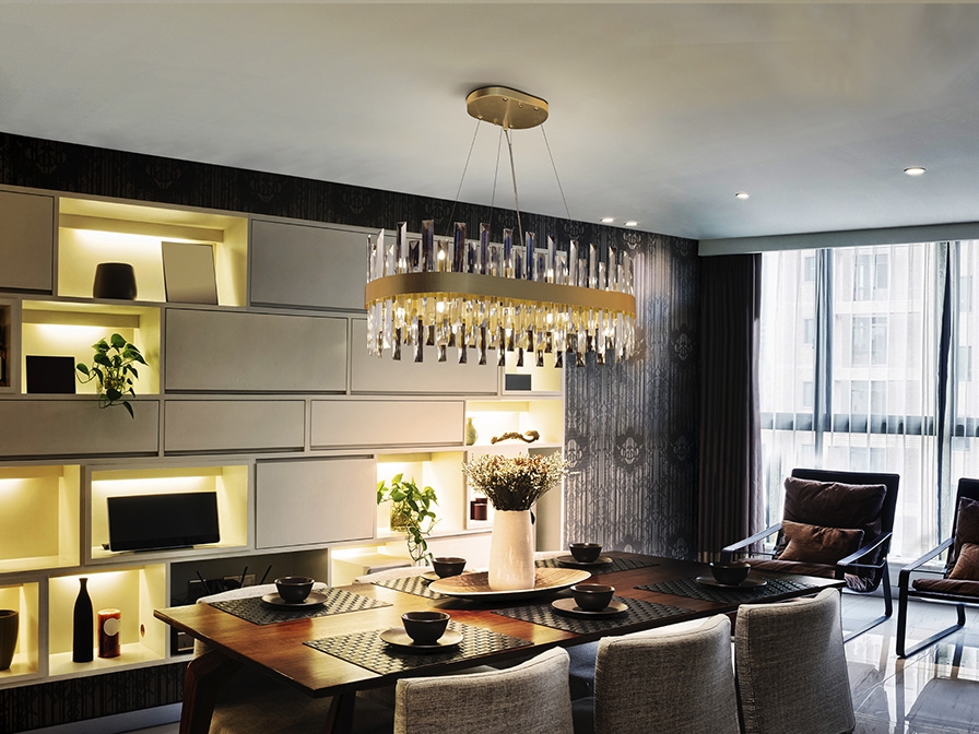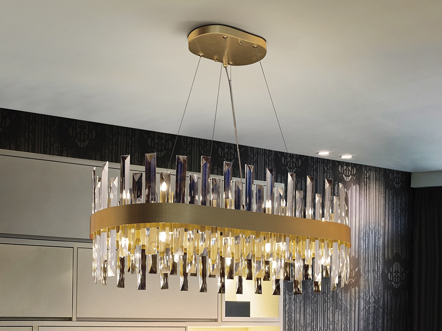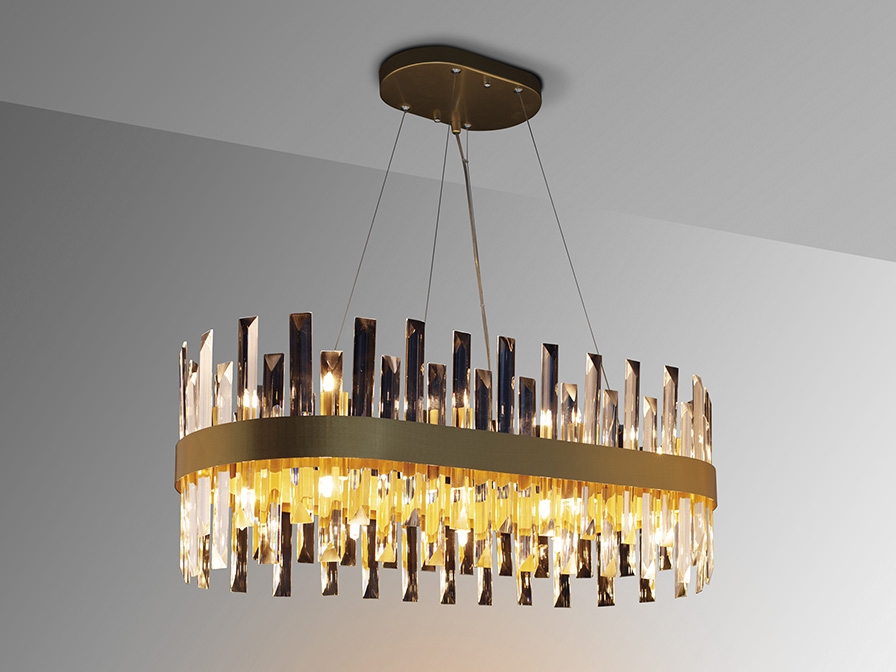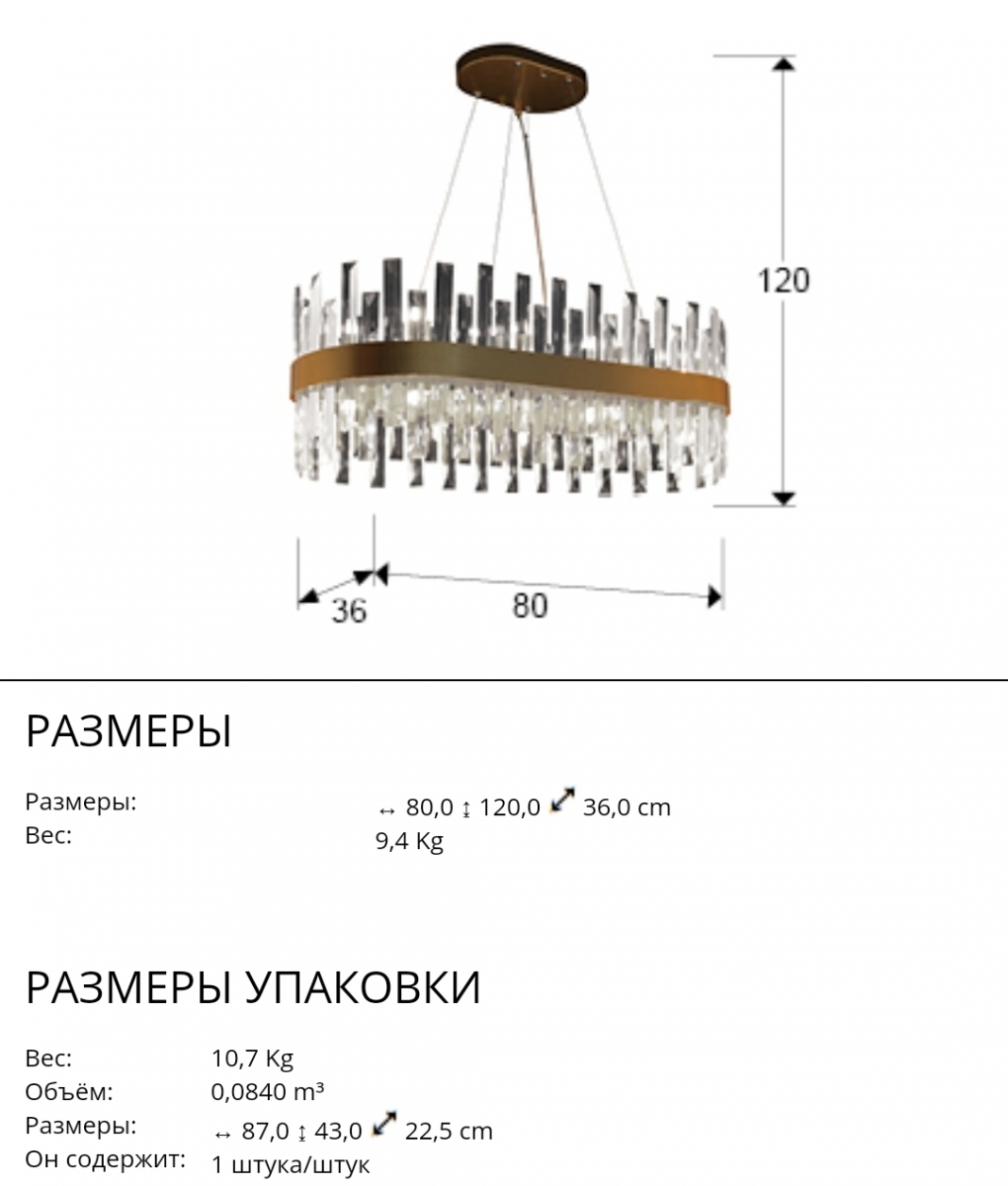 Овальный светильник из новой стильной коллекции Grace изготовлен из металла с матовой золотой отделкой. Необычный плафон составляют 56 прозрачных стеклянных элементов с огранкой и чередованием по высоте. За счет этого люстра выглядит сияющей и роскошной и отлично смотрится в современных интерьерах. 20 лампочек с цоколем G9 расположены сверху и снизу внутри абажура. На фото бежевый оттенок стеклу придают лампочки теплого света из комплекта поставки 3,5W led. При желании можно поставить их с яркостью дневного белого света. Максимально возможная мощность ламп 20 шт*20W.