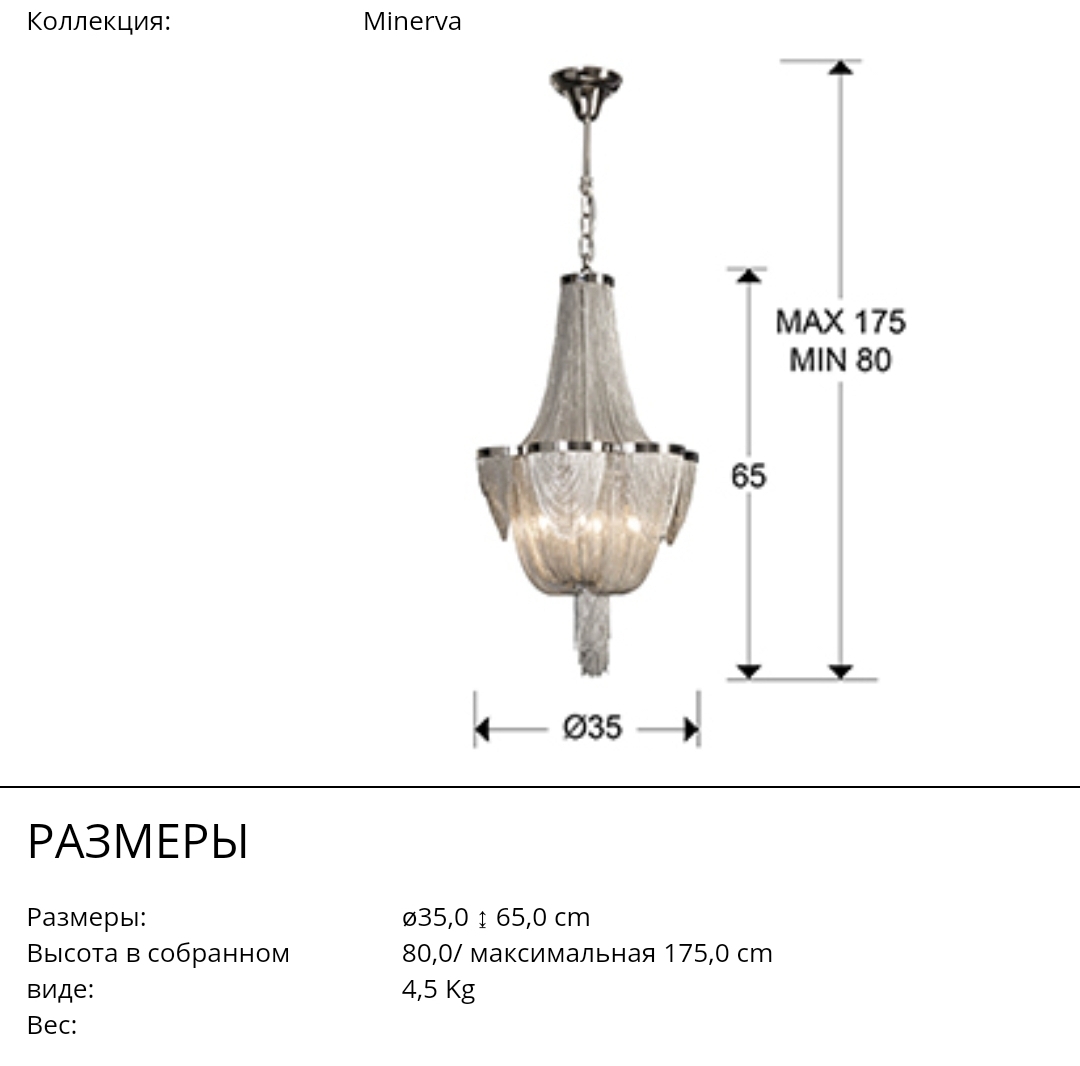 Каскадная современная небольшая люстра Minerva диаметром 35 см образована тонкими, многочисленными металлическими цепочками с покрытием "никель". Лампочки: 6 шт с цоколем G9 6W теплого света 3000К входят в комплект. Максимальнодопустимаямощность: 6х42W led.