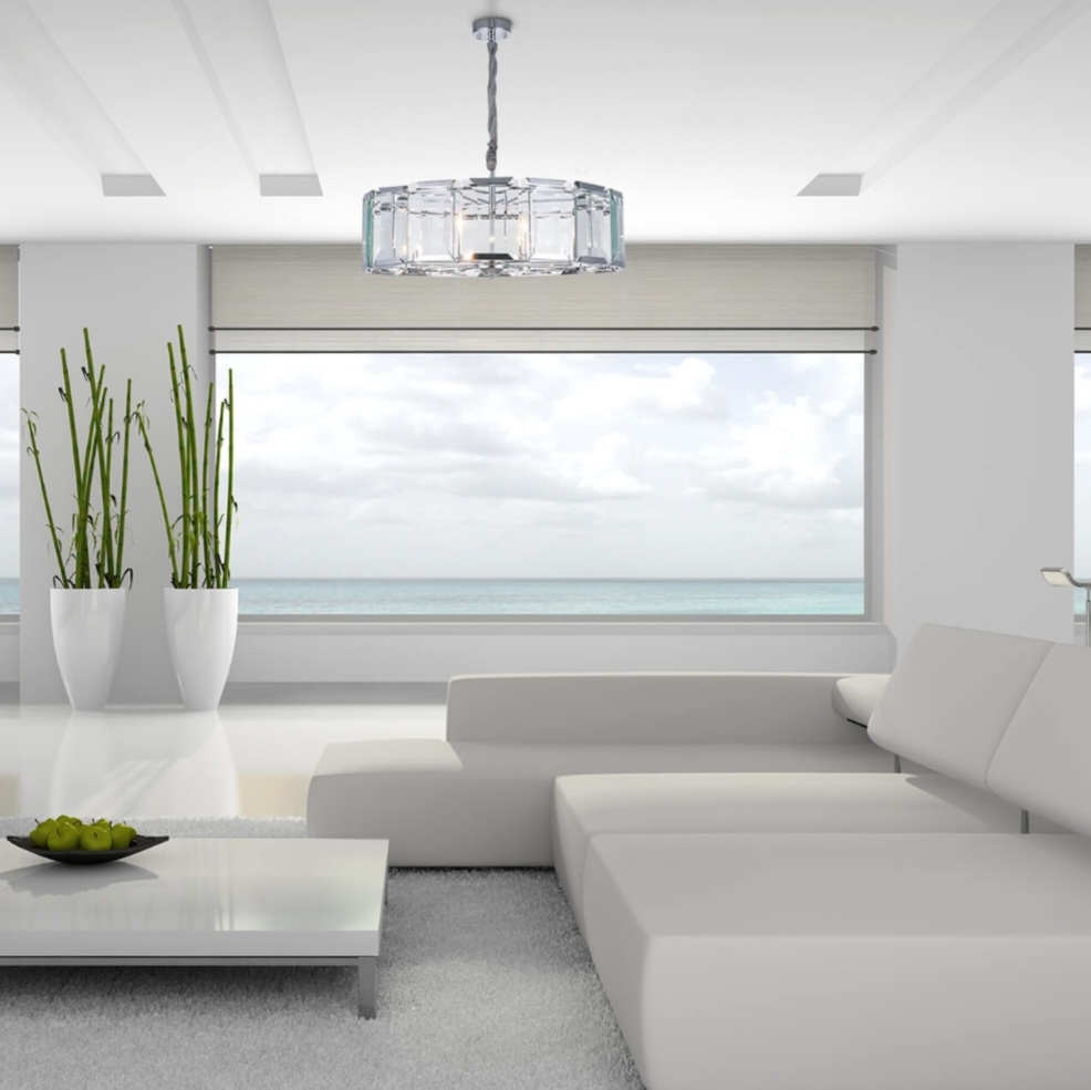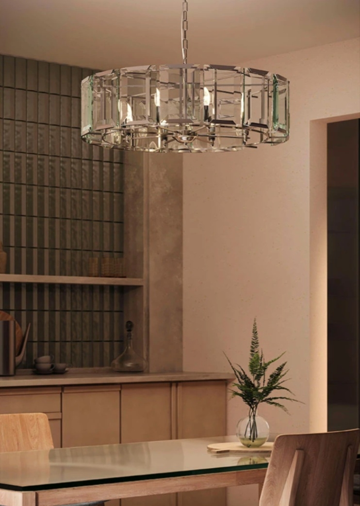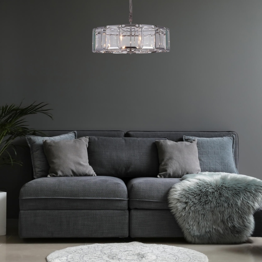 Современная широкая круглая люстра со стеклянными эффектными пластинами с огранкой у плафона высотой 25 см. Отделка металлического каркаса хромированная. Диаметр светильника 78 см. Длина цепи 45 см. Максимальная допустимая мощность лампочек 60 Вт* 8 шт, патрон E14. Площадь освещения 21 м2. Вес 18,43 кг. Крепление на планку.
