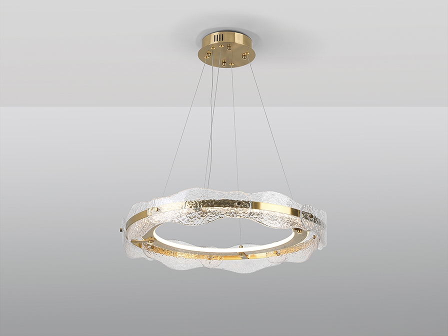 Современная люстра- обруч из коллекции Lira с эффектной золотой отделкой. Новое прочтение классики дизайнерами. Абажур образуют фактурные стеклянные прозрачные пластины полукруглой формы, закрепленные на шлифованном металлическом основании. Высота подвешивания регулируется по необходимости. Светодиодное освещение 42 Вт, 1800 Lm, теплый свет 3000К. Средний срок службы рассчитан на 20000 часов.