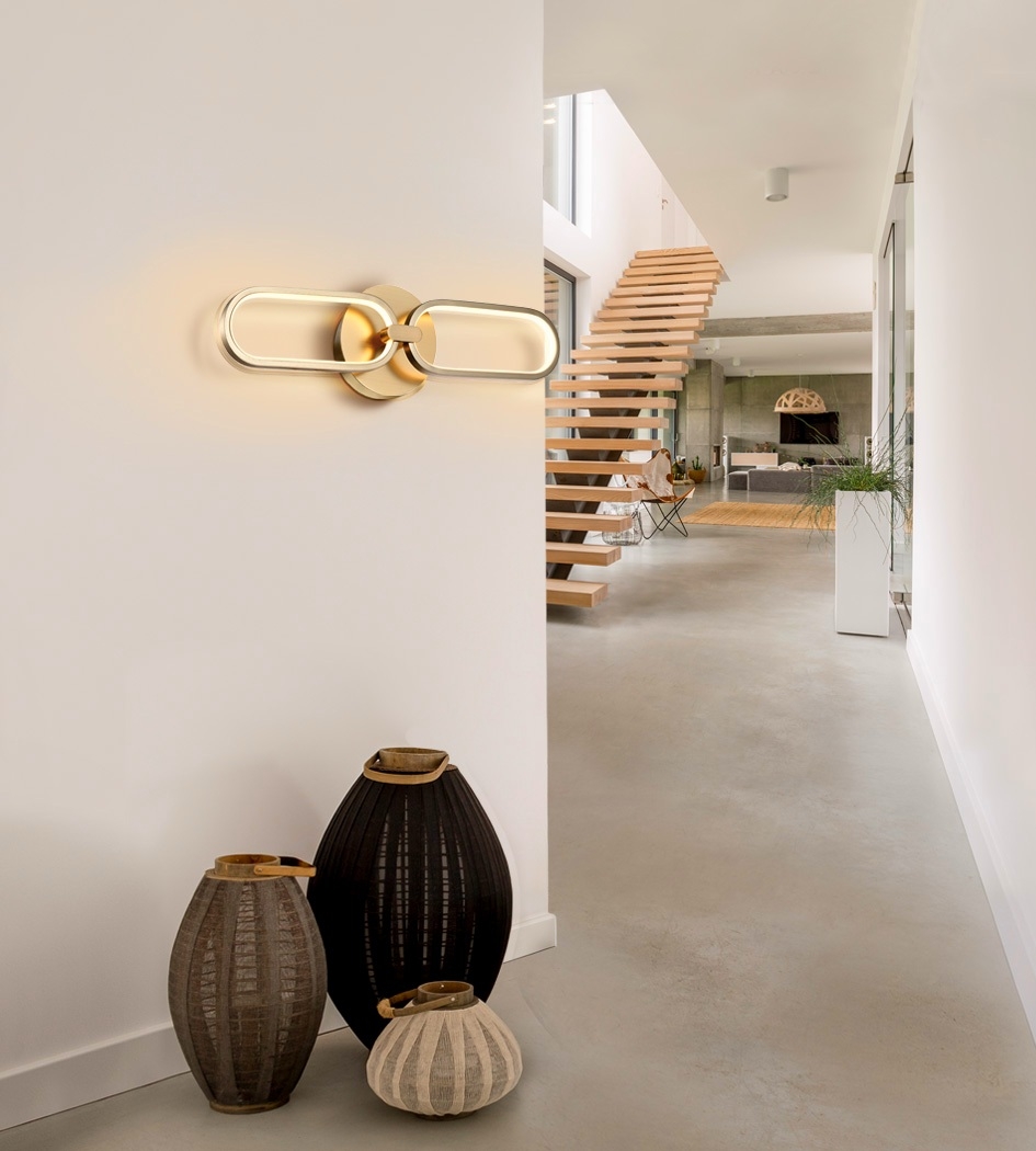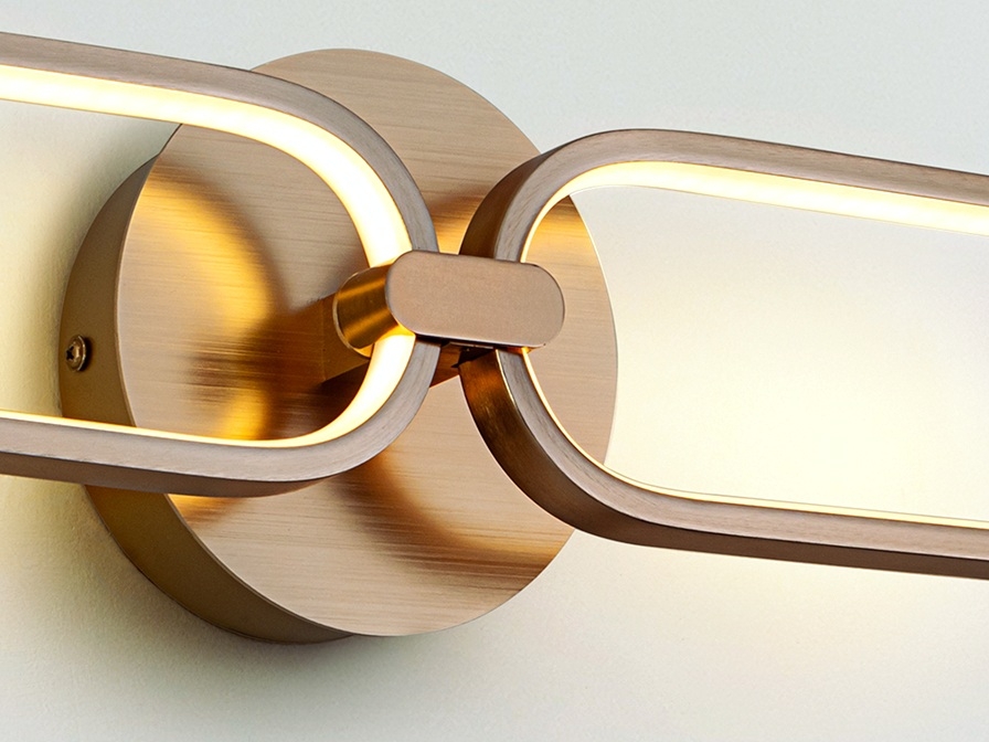 Настенный светодиодный светильник из коллекции Colette с абажуром в виде двух овалов, напоминающих символ бесконечности. Изготовлен из легкого алюминия с матовым шлифованным золотистым покрытием. Силиконовые рассеиватели опалового цвета расположены по внутреннему контуру бра. Световой поток: 13W LED, 1170 Lm, теплый свет 3000 K.