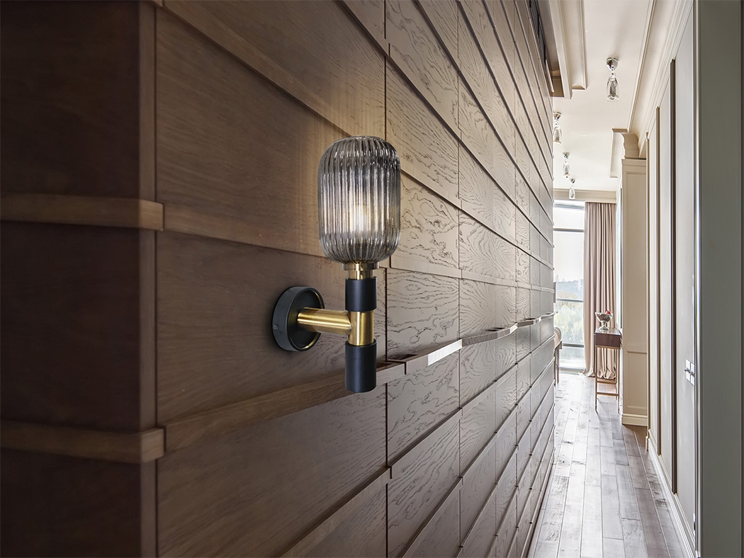 Настенный светильник Norma 225960 с одним вертикальным рифленым плафоном из красивого серо- дымчатого стекла. Основание изготовлено из металла матово-черного цвета с контратными деталями из сатинированной латуни. Это бра стильно сочетается и с популярной отделкой стен под дерево, и с покраской. Плафон цилиндрический диаметром 14 см.