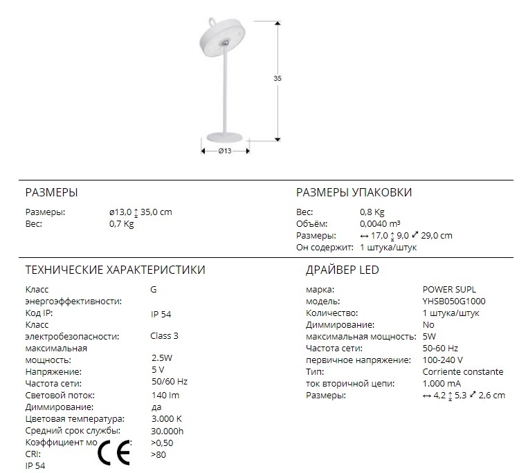 2.5W LED, 140lm, 3000K, IP54.
