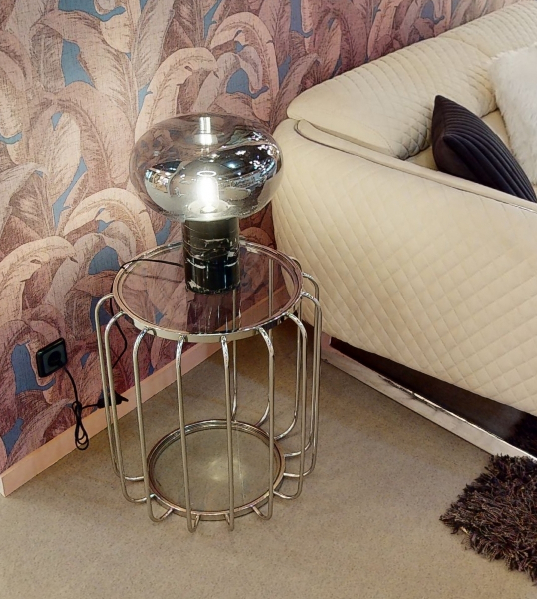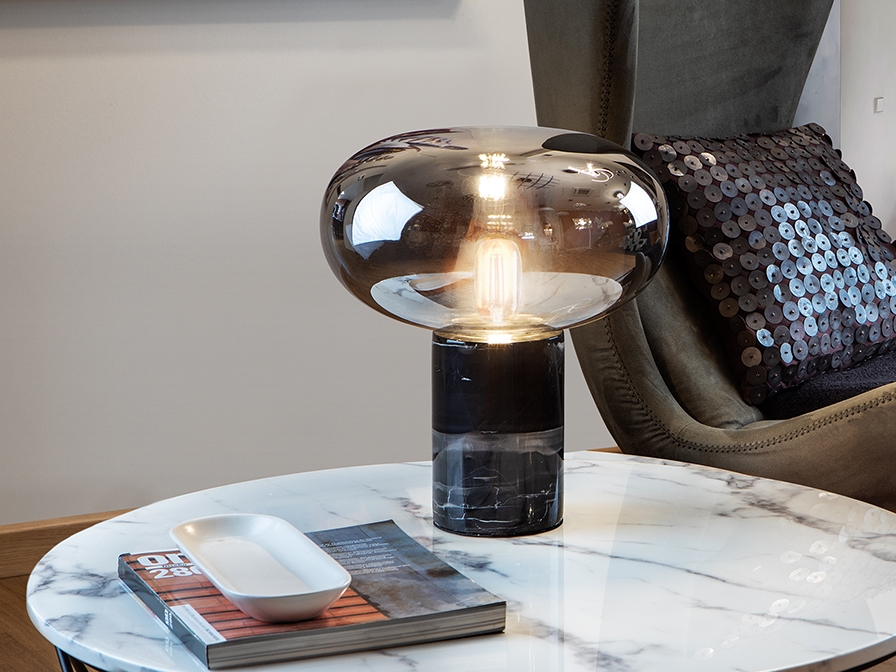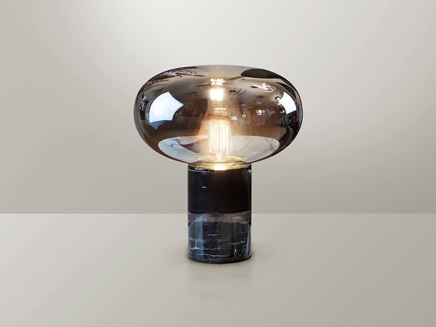 Настольная лампа из новой стильной коллекции Fungi от фабрики Schuller с ножкой из массивного чёрного мрамора и абажуром из выдувного стекла дымчатого зеркального цвета. Лампочка 1шт с цоколем E27 LED 8W тёплого света 2700 К входит в стоимость. При желании можно поставить с холодным светом и оттенок плафона при включении станет более серым.