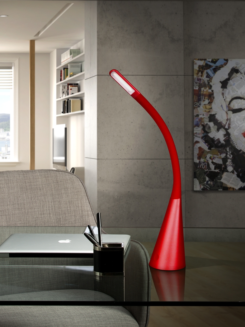 Современная яркая настольная рабочая лампа LED из силикона и алюминия матового красного цвета. Регулируемая по высоте ножка-штатив. Сенсорный регулятор яркости света в 2х режимах позволяет выбрать освещение ярче либо приглушеннее. Удобный USB на обратной стороне лампы для зарядки мобильных устройств. 5W LED, 320 Lm, 4000 K. DRIVER: 110/220V, 50-60Hz