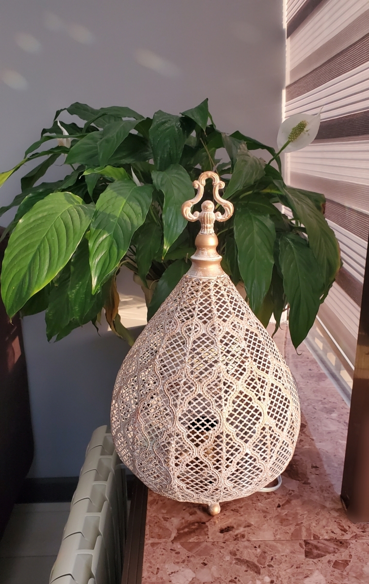Интересная настольная лампа- фонарь с абажуром из резного чеканного металла. Покрытие золотое с белой патиной. Одна лампочка с цоколем Е27.