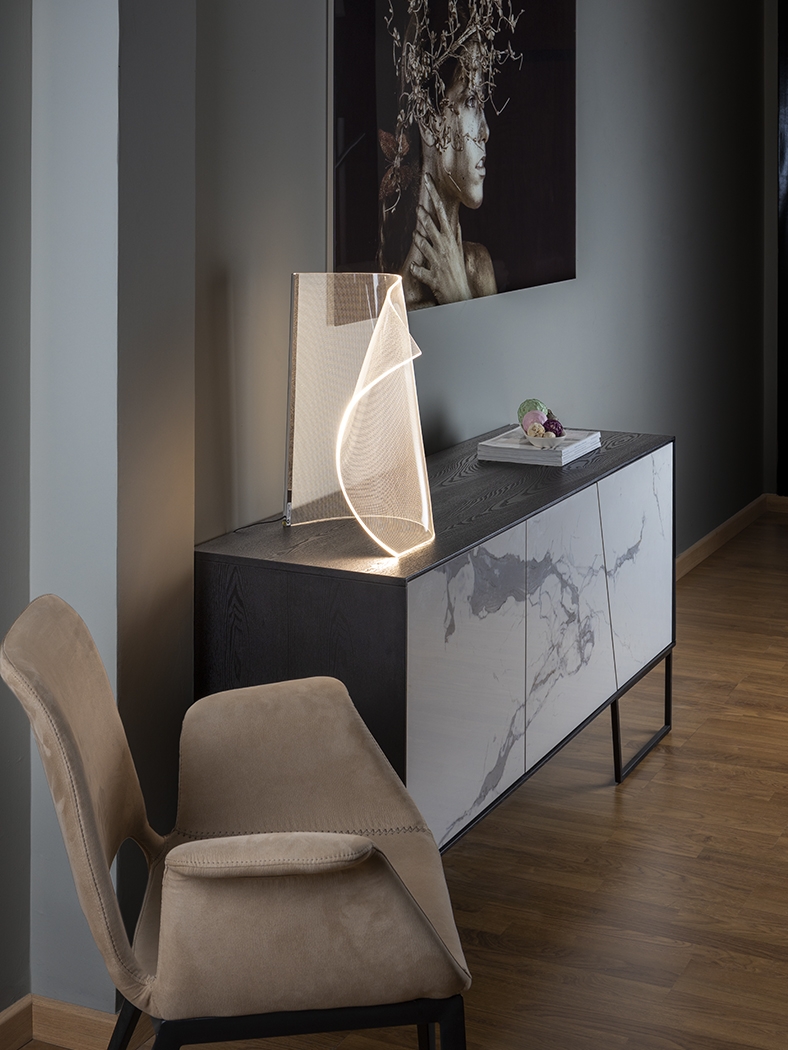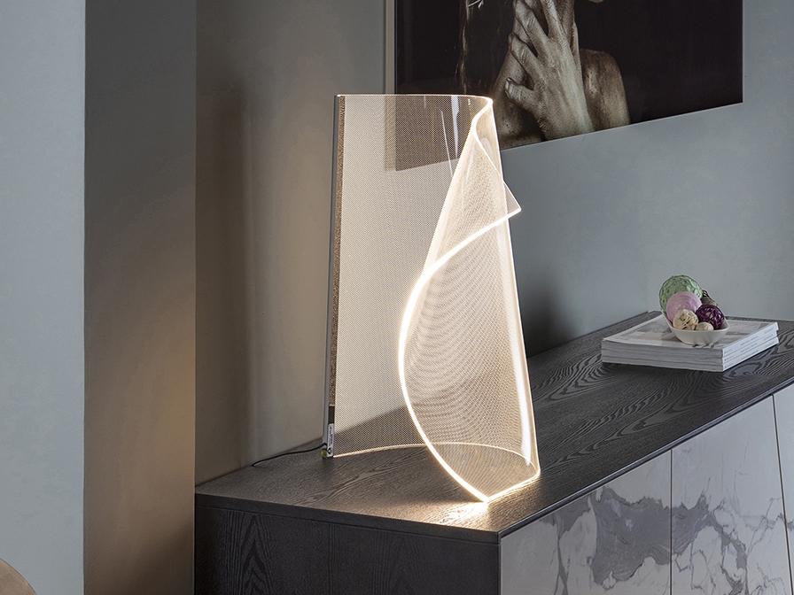Оригинальная светодиодная настольная лампа Velos в форме стилизованного изогнутого листа из современного метакрилата с микропечатью. Интересный арт объект с данными светового потока: 10W, 600 lm, теплый свет 3000K .