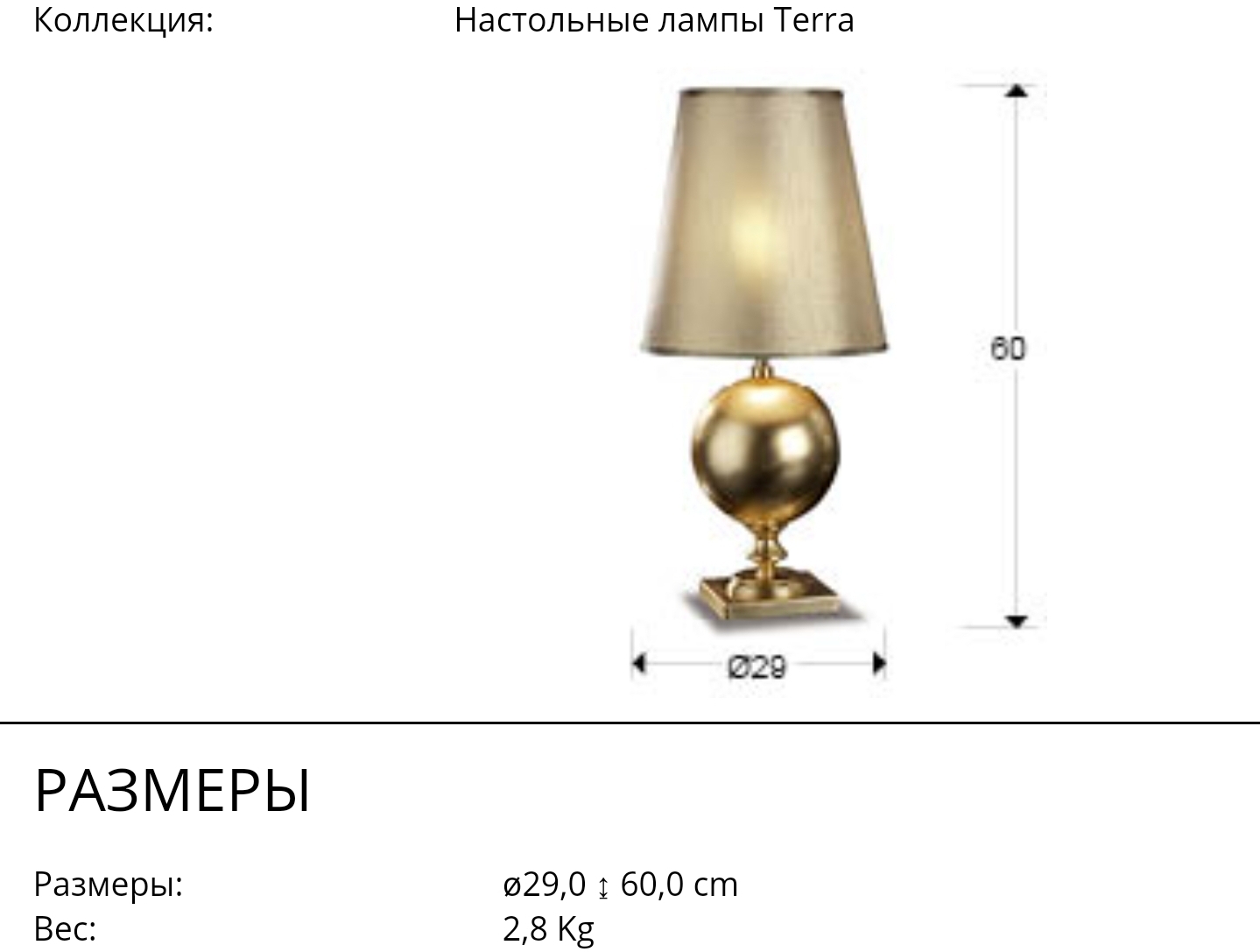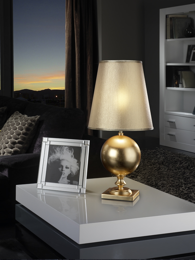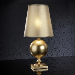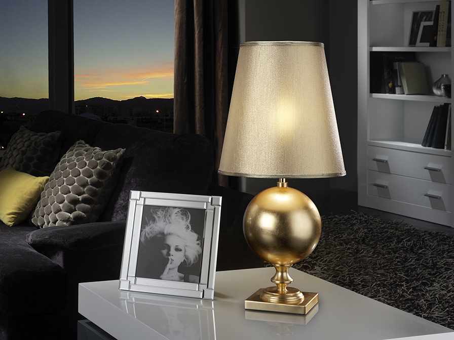 Современная настольная лампа Terra из металла с интересной ножкой в форме шара, покрытого золотой фольгой. Высота светильника 60 см. Плотный абажур изготовлен из золотистой ткани. 1 лампочка с цоколем E27 LED 10 Вт входит в комплект поставки. Максимальная мощность 60 Вт.