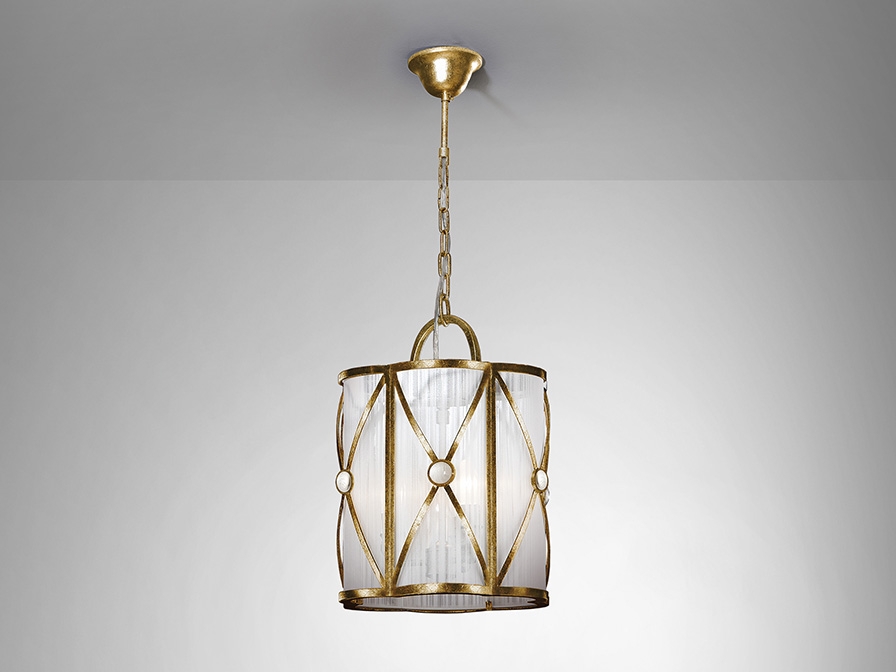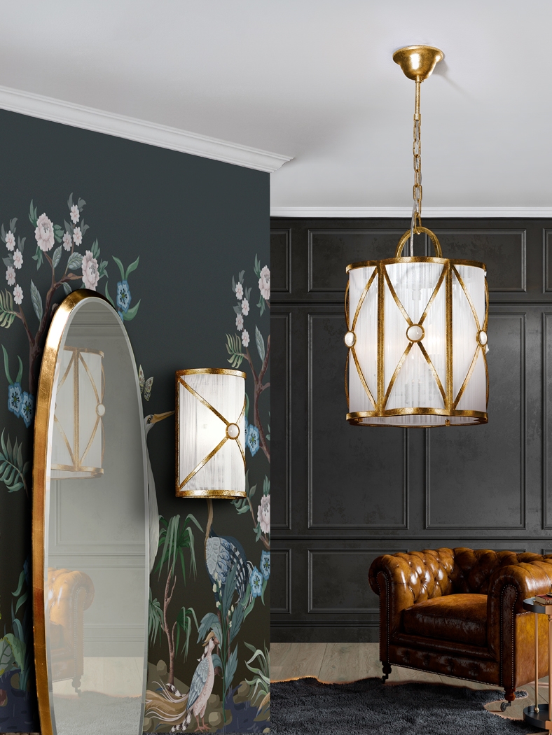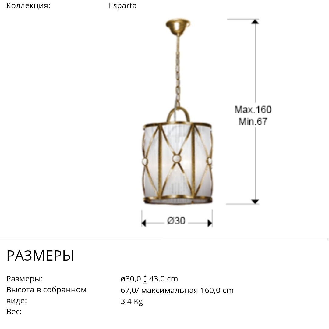 Высокий объёмный подвес в классическом стиле из коллекции Esparta золотого цвета с отделкой сусальной фольгой с патиной. Фигурный абажур диаметром 30 см с каркасом из металла с чернением декорирован тонкими белыми нитями. По центру перекрестий присутствует лаконичный декор- полусферы из прозрачного стекла. Легкая и по внешнему виду, и по весу- всего 3,4 кг люстра подойдёт и для помещений с натяжными потолками, и для различных по стилистике интерьеров от классики до романтичного прованса. Интересно смотрится и в единственном экземпляре, и в парном сочетании. Лампочки 3 шт с цоколем E14 LED 7W входят в комплект.
