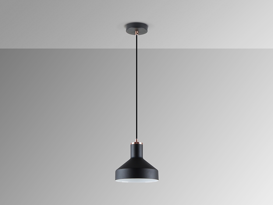Подвесной светильник из новой коллекции Irias с одним широким плафоном диаметром 18 см изготовлен из металла, окрашенного в черный матовый цвет, с деталями из сатинированной меди. Регулируемая высота подвешивания. 1 лампочка с патроном E27 максимально допустимой мощности 20 Вт.