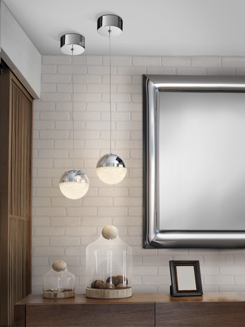 Современная эффектная коллекция светильников шаров Sphere с основанием из глянцевого металла в цвете "хром". Артикул 793301- это одиночный потолочный подвес с плафоном в виде шара диаметром 12см с регурируемой высотой подвешивания. Плафон изготовлен из поликарбоната гладкого снаружи и фактурного внутри. При включении света, благодаря многочисленным маленьким внутренним шарикам, весь светильник красиво искрится. В коллекции Sphere есть также подвесы с бОльшим диаметром - 20 см, поэтому при необходимости и согласно дизайн проекту можно собрать композицию из нескольких моделей. Купить любой светильник фабрики Schuller просто- оформив заказ на нашем сайте в любое время.