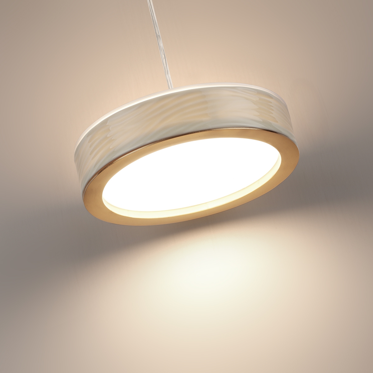 Уникальные led светильники с отделкой плафонов керамикой ручной работы из новой коллекции Riviera бренда Odeon light в сочетании с современными технологиями. Подвес светлого песочного цвета с объемной фактурной поверхностью в виде волн и металлом в отделке античной бронзы. У модели есть удобный переключатель цветовой температуры 2000К- 3000К- 4000К, расположенный на основании плафона, для создания наиболее подходящего освещения в интерьере. Высота подвешивания регулируется, при этом декоративный хрустальный шар с пузырьками свободно перемещается по тросу в желаемое положение. Общая мощность 32 W. Световой поток 457 Lm. Источник света светит и вверх, и вниз.