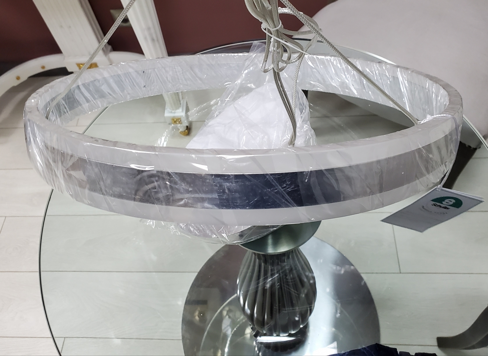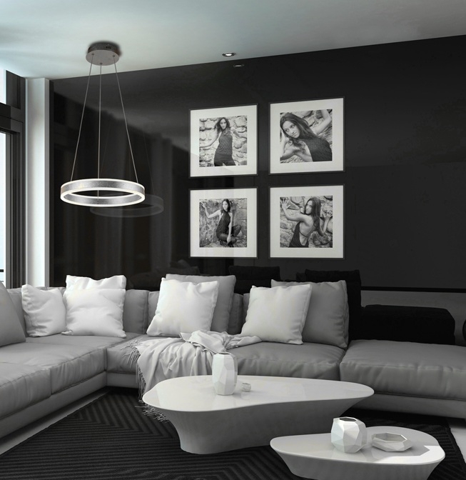 Модная светодиодная люстра- кольцо Helia диаметром 50 см с декоративной отделкой из эффектной серебряной фольги холодного оттенка. Изготовлена из металла и алюминия, которые обрамляют акриловый абажур приятного опалового цвета. Высота подвешивания регулируется по желанию с учётом высоты потолка в конкретном интерьере. Световой поток 55W LED, 3300 Lm, теплого оттенка 3000 K. Средний срок службы рассчитан на 25000 часов.