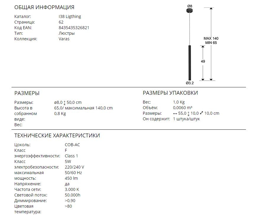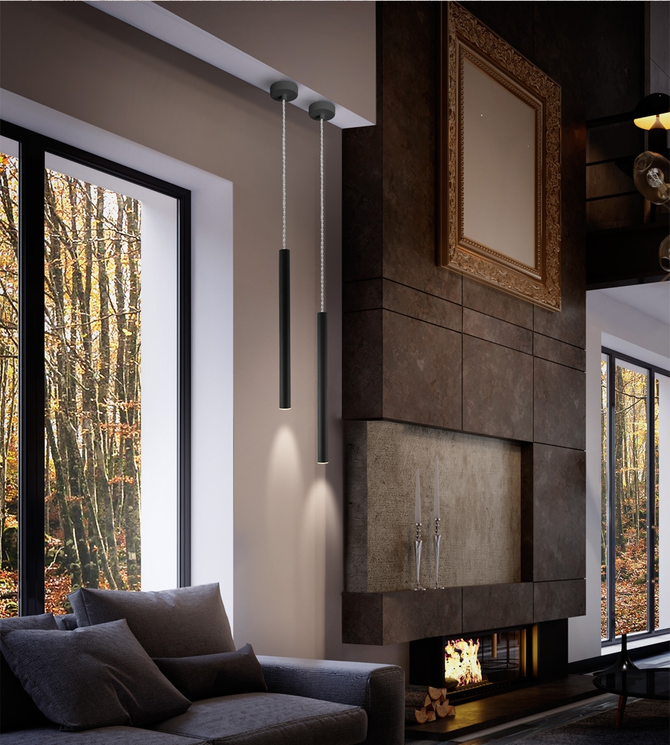Узкий подвесной светодиодный светильник- трубка из коллекции Varas. Металлическая основа изготовлена в черном матовом цвете с легкой зернистостью. В нижней части высокого подвеса небольшой кружок- акриловый рассеиватель опaлового цвета. Световой поток 5W LED, 450 Lm, теплого света 3000 K. Диммируемый. Интересно смотрится в современных интерьерах при составлении композиции разной высоты или комбинации светильников разных цветов, например, с хромовым либо золотым. Потолочная чаша диаметром 8 см. Срок службы рассчитан на 50 000 часов.