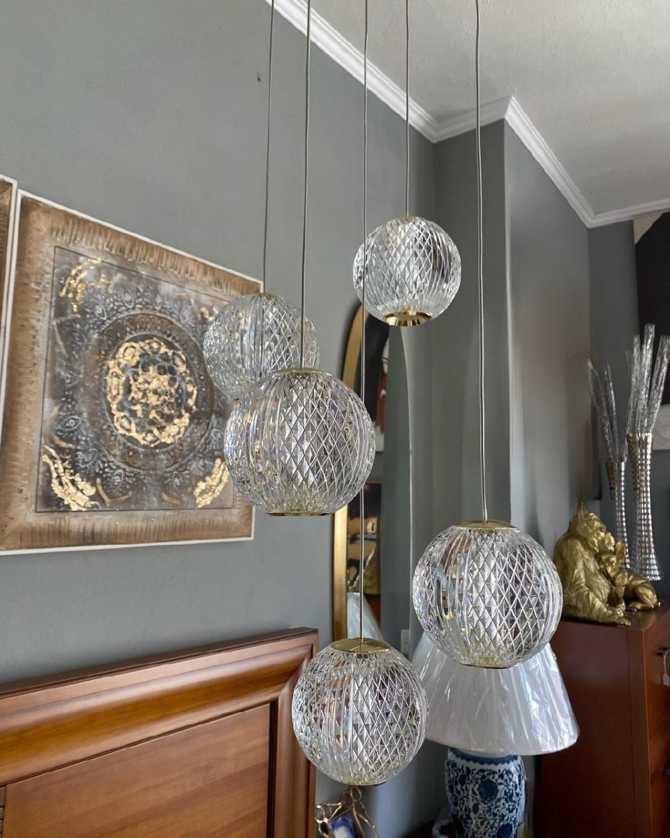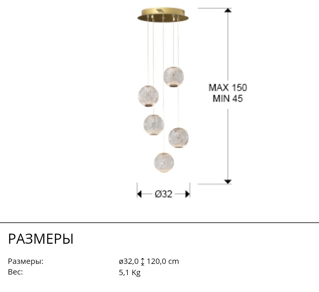 Подвесная люстра- каскад Austral представляет собой круглое золотое основание с пятью регулируемыми по высоте оригинальными круглыми резными шарами диаметром 11 см из прозрачного оптического акрила, подобного стеклу. В нижней части каждый подвес украшает глянцевое золотое кольцо . Мощность светодиодного светильника 26W LED, 1264 Lm, цветовая температура 3200K. Срок службы рассчитан примерно на 30000 часов. Красиво смотрится при оформлении современной кухни, спальни, а также придиванной зоны в интерьере гостиной.