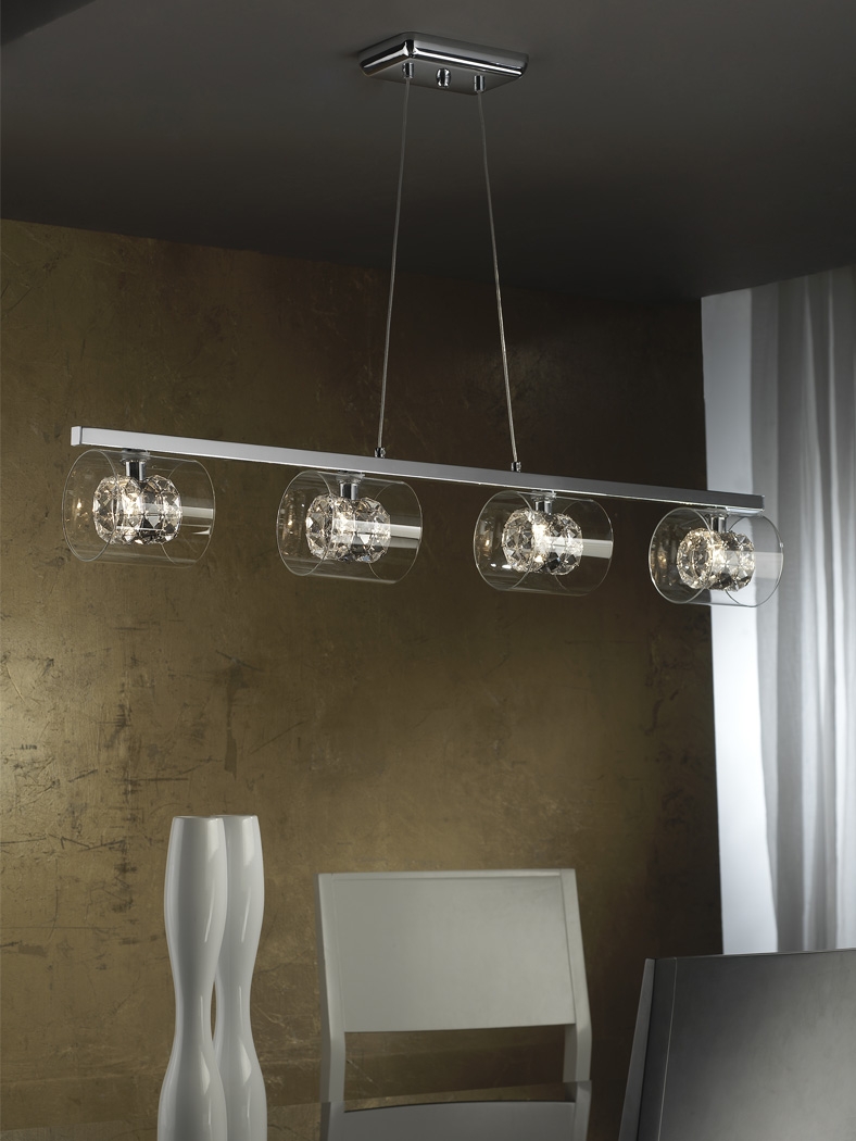 Длинный подвесной светильник Flash с каркасом из металла с глянцевым покрытием хром и четырьмя цилиндрическими необычными плафонами. Внешний прозрачный плафон изготовлен из прессованного стекла, внутренний состоит из кольца сочетающихся квадратных кристаллов из прозрачного и дымчатого стекла с огранкой.