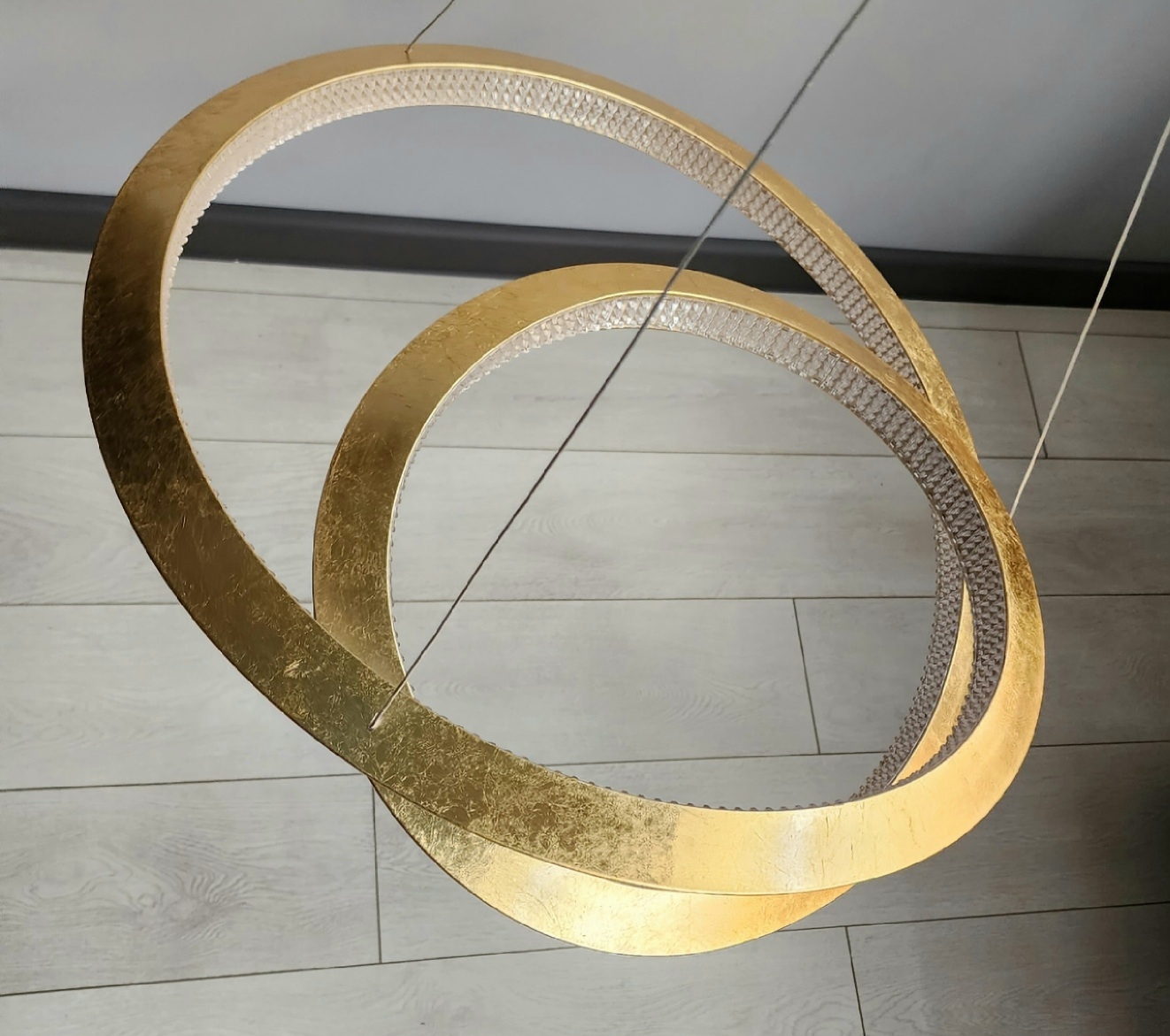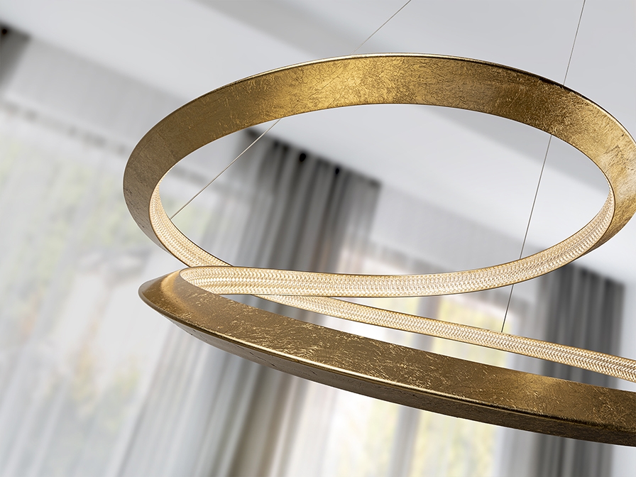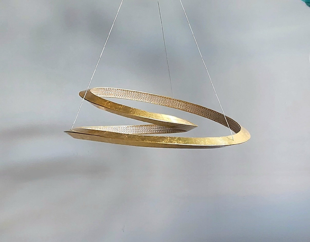 Оригинальный фигурный светодиодный светильник- завиток Eternity от бренда Schuller. Металлический абажур- объемная лента диаметром 60 см сделан с красивой отделкой золотой сусальной фольгой и фиксировано держит форму. По его внутреннему контуру расположен источник света, который закрывают декоративные прозрачные элементы из акрила. Высота подвешивания этой стильной люстры регулируется по необходимости, световой поток 45W LED, тёплый свет 3000К. Потолочная чаша с глянцевой золотой отделкой.