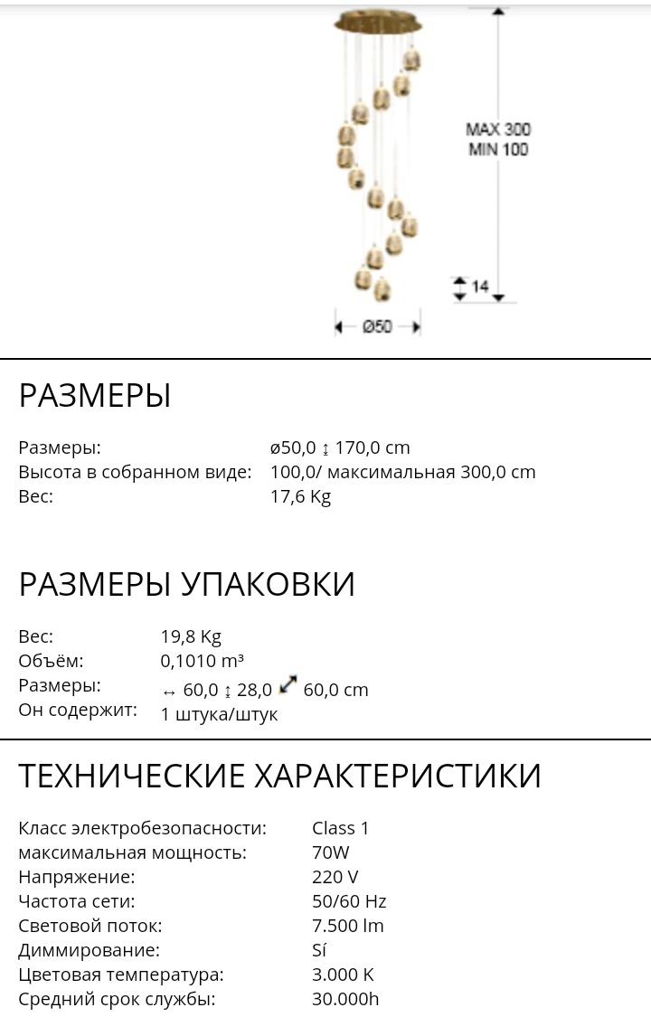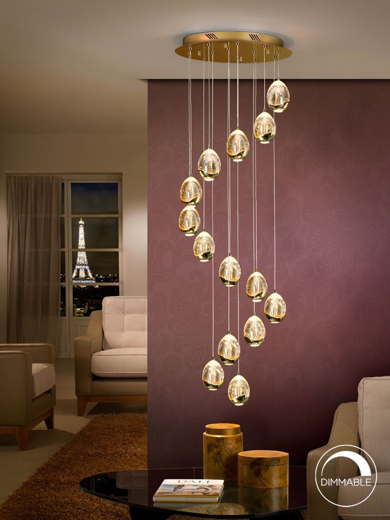 Подвесной светодиодный светильник- каскад Rocio от фабрики Schuller с основанием диаметром 50 см из металла в цвете "глянцевое золото". Плафоны изготовлены в форме капли из массивного стекла цвета шампань с декоративными пузырьками внутри, с регулируемой высотой, 70W LED, 6720 Lm, 3000K. В комплекте пульт управления. Средний срок службы рассчитан на 50 000 часов.