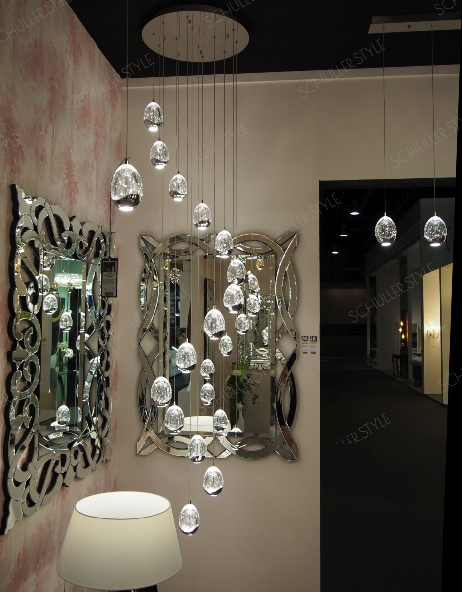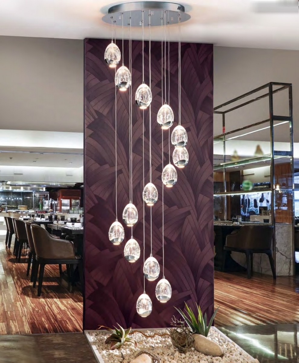 Стильная люстра- каскад из коллекции Rocio с основанием из металла цвета "хром". 14 подвесов в форме капель из массивного стекла с декоративными пузырьками внутри регулируются по высоте до 500 см, открывая возможности для оформления загородных домов с высокими потолками. Внутри подвесов расположены диоды общей мощностью 70W LED, 6720 Lm, теплого света 3000 K , которые испускают свет и вниз, и вверх, красиво подсвечивая пузырьки воздуха. Средний срок службы светильника рассчитан на 50 000 часов. Особенностью этой модели является то, что она управляется с пульта.