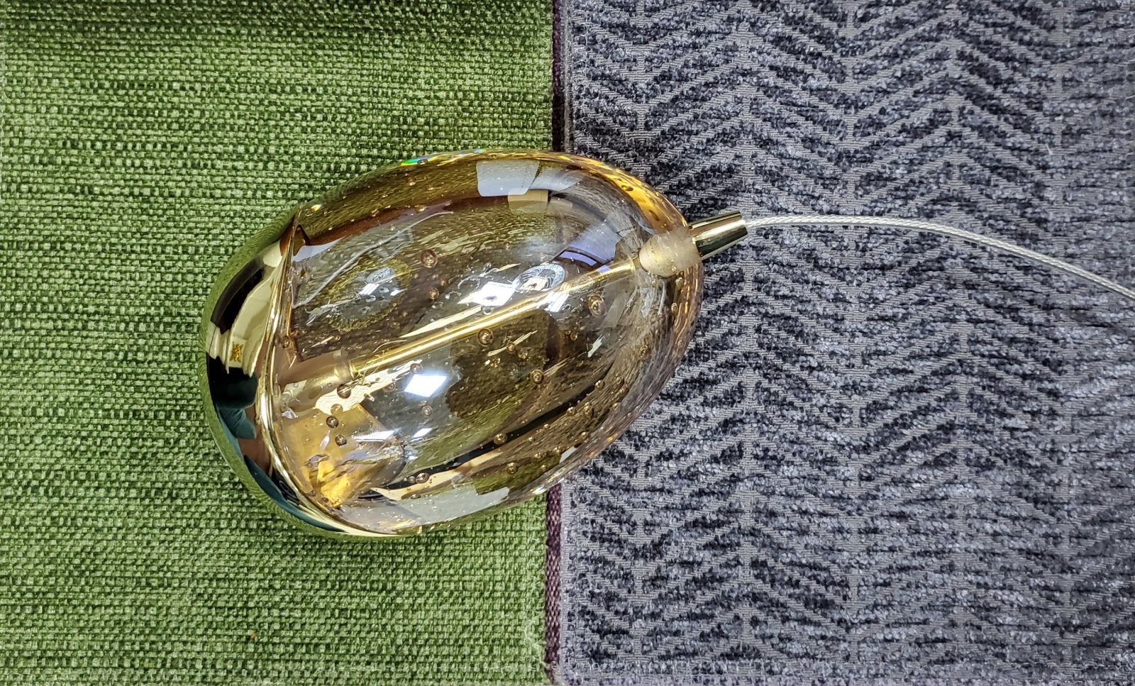 Оригинальный светодиодный светильник с тремя каплевидными прозрачными плафонами из стекла цвета "шампань", заполненными многочисленными пузырьками воздуха, отражающими попадающий на них свет. Отделка каркаса в цвете "золото". Высота каждого подвеса регулируется. Лампочки уже внутри каждой "капли": 15W LED, 1008 Lm, 3000.