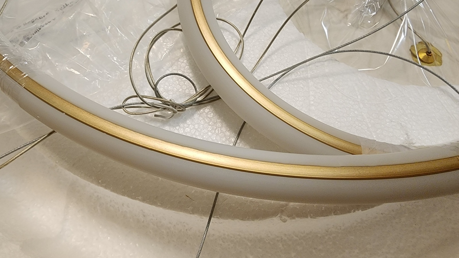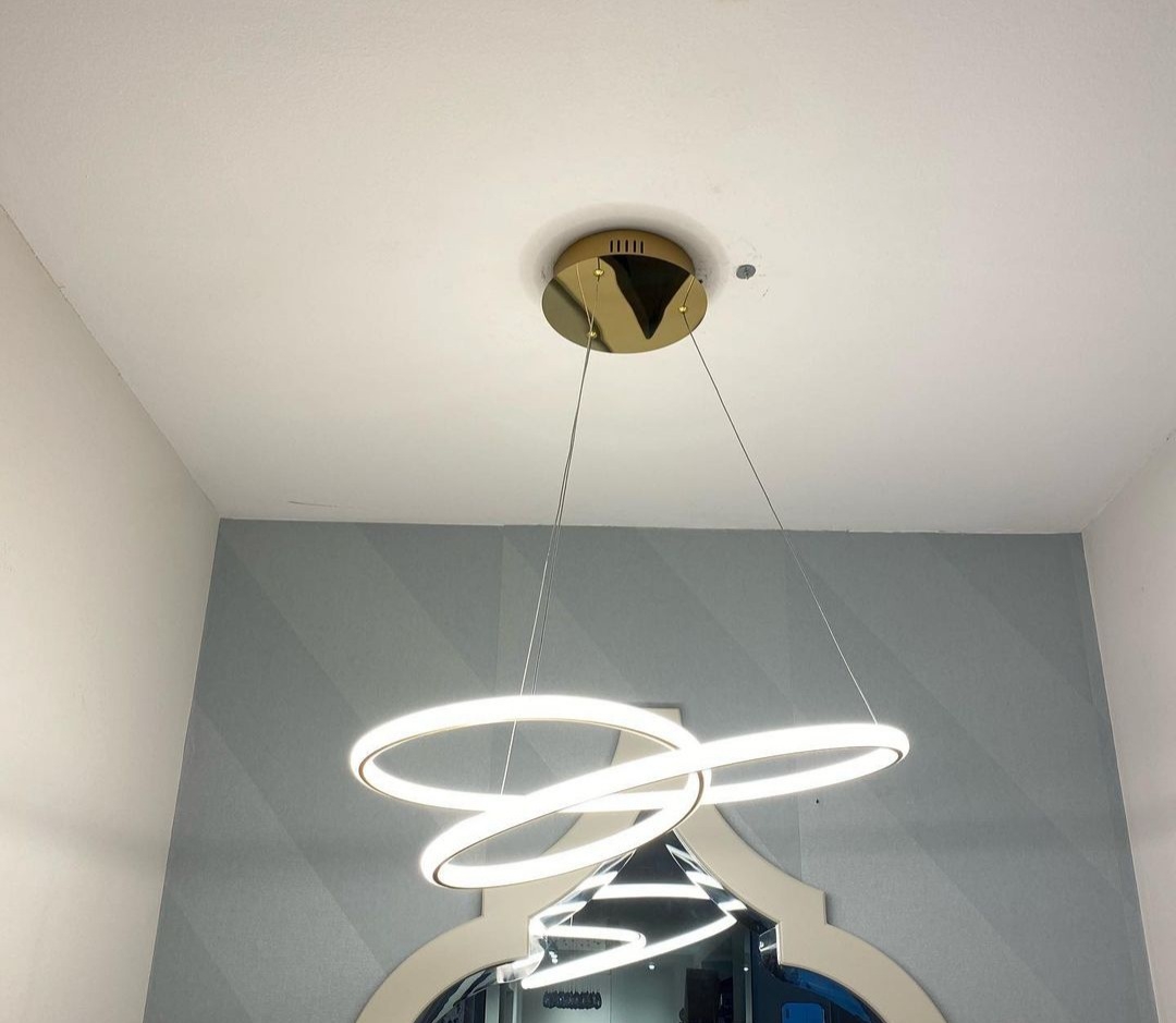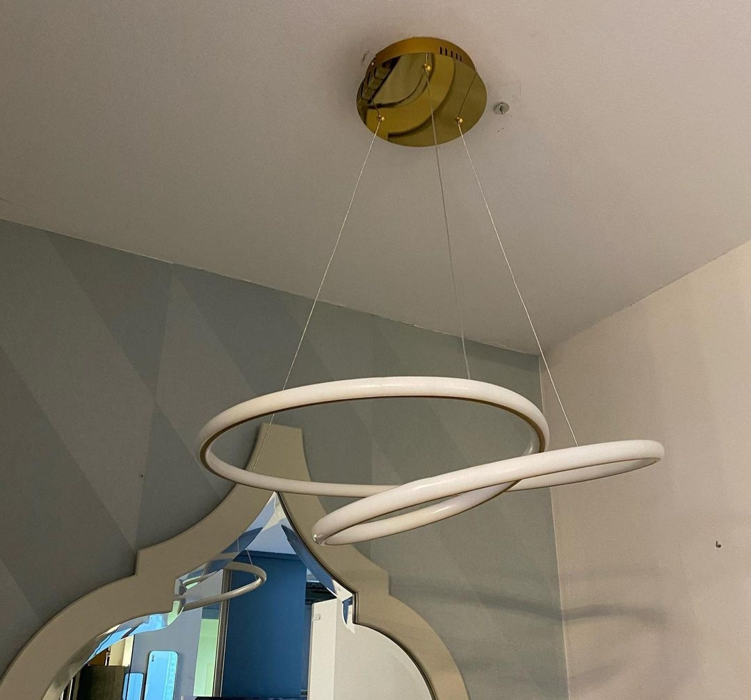 Современный подвесной спиралевидный светильник Tube диаметром 60 см сделан из металла и алюминия c золотым покрытием: глянцевым на потолочной чаше и матовым на витом абажуре. По контуру его расположен трубчатый силиконовый рассеиватель матового опалового цвета. Регулируя высоту тросов, можно менять финальный вид люстры: выше либо ниже опуская завиток, наклоняя либо выравнивая по горизонтали радиусные дуги. Одна модель, но смотрится по-разному.
