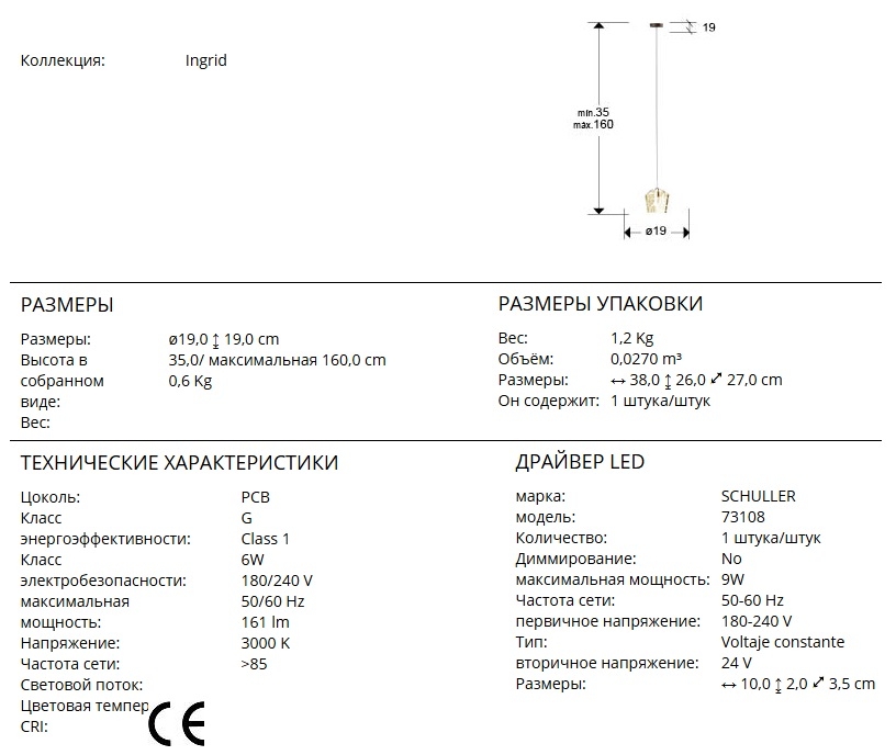 Одиночный подвес Ingrid со стеклянным объемным плафоном оттенка шампанского. Металлическая потолочная база d12 см и декоративные детали изготовлены из шлифованного алюминия, окрашенного в темно-бронзовый цвет. Особенность коллекции -светодиодное кольцо с силиконовым рассеивателем внутри прозрачного плафона. Длина подвешивания светильника регулируется до 160 см. Световой поток 6W LED, 161 lm, теплый свет 3000K. Размеры основания для крепления (отверстие для крепления): d12 х 3,5 cм.
