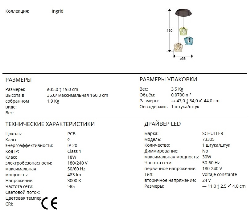 Светильник-каскад Ingrid с тремя объемными разноцветными плафонами диаметром 19 см каждый. Особенность коллекции -светодиодное кольцо с силиконовым рассеивателем внутри прозрачных плафонов из стекла трех цветов: светло- зеленого, голубого и шампань. Металлическая круглая потолочная база диаметром 35 см и декоративные детали изготовлены из шлифованного алюминия, в темно-бронзовом цвете. Длина подвешивания каждого подвеса регулируется до 160 см. Световой поток: 18W LED, 483 lm, теплый свет 3000K. Размеры основания для крепления (отверстие для крепления): d30х 4 cм.