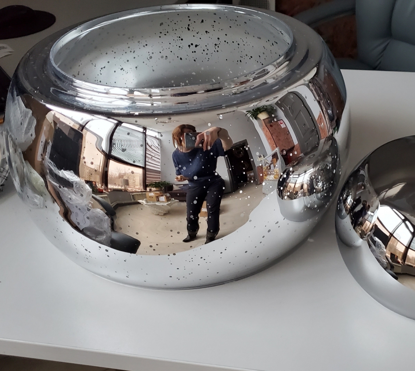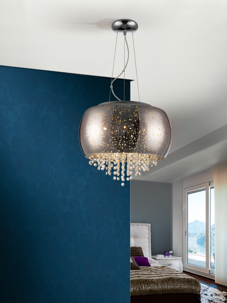 Подвесной светильник из коллекции Caelum фабрики Schuller с зеркальным плафоном, усыпанным светящимися при включении точками. Особенность модели- длинные декоративные стеклянные подвески внутри абажура.