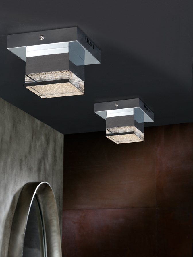 Квадратный потолочный светодиодный светильник Prisma с размерами всего 14* 14 см можно использовать как точечное декоративное освещение коридора, балкона либо гостиной. основание сделано из металла с глянцевым покрытием "хром". Плафон гладкий, ровный снаружи -из прозрачного акрила с внутренней фактурно- зернистой поверхностью. 4W LED, 336 Lm, теплый свет 3000 K.