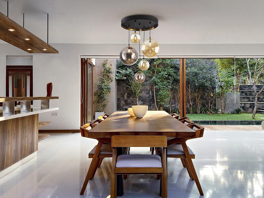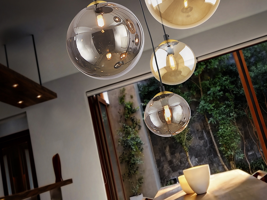 Круглый потолочный светильник 45 см из коллекции Dark фабрики Schuller с прозрачными плафонами- эффектными шарами из стекла дымчатого и янтарного цвета диаметром 12 и 20 см и регулируемой высотой подвешивания. Цветовую гамму дополняет чёрное металлическое основание с декором на внутренней части в цвете латуни. Современная модель для разных интерьерных пространств. 5 лампочек с цоколем G9 LED 4W в комплекте. Максимально допустимая мощность: 5x28W.