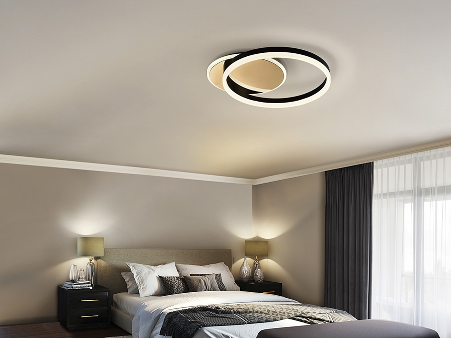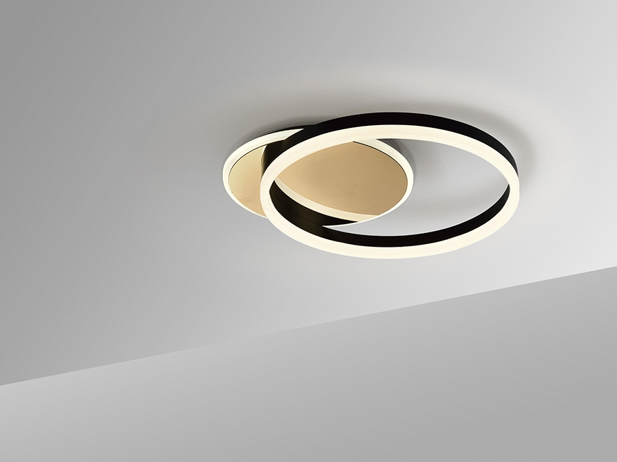 Круглый потолочный led светильник из новой коллекции Oriel фабрики Schuller. Оригинальное и одновременно лаконично- оптимальное сочетание формы и материалов для оформления современного интерьера: золотой центральный диск из стали и круглый плафон в черном матовом цвете из алюминия с силиконовым диффузором опалового цвета по контуру. Мощность 38W LED. 1400 lm, теплый свет 3000 K.