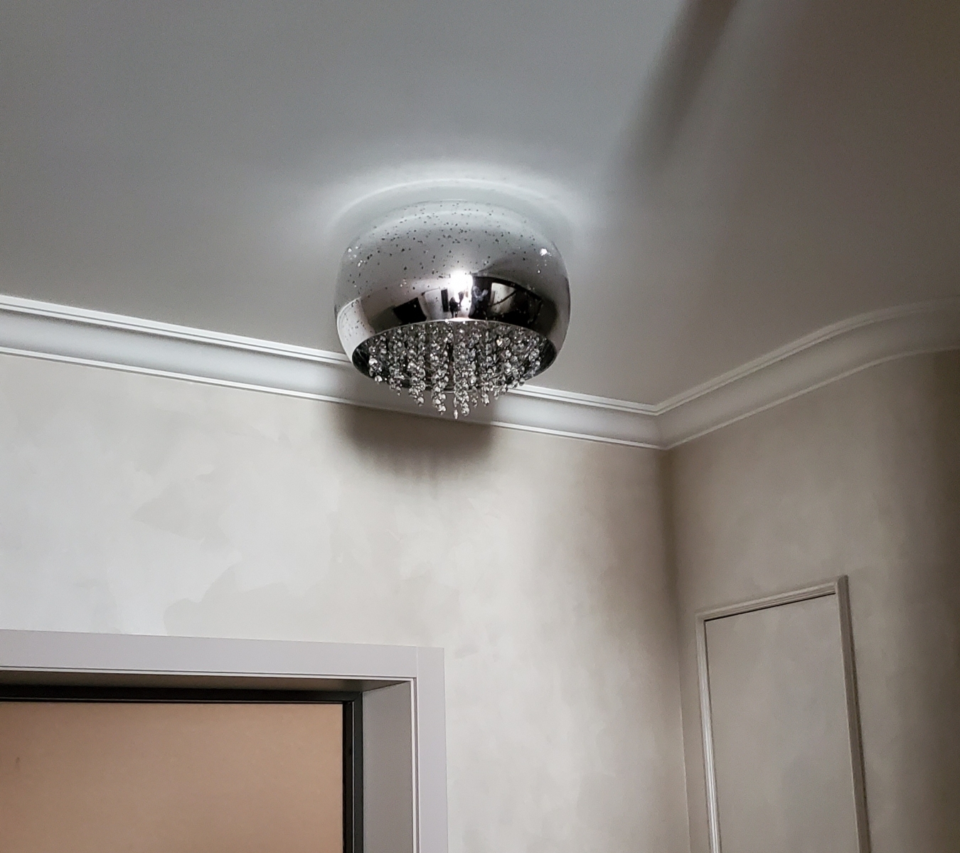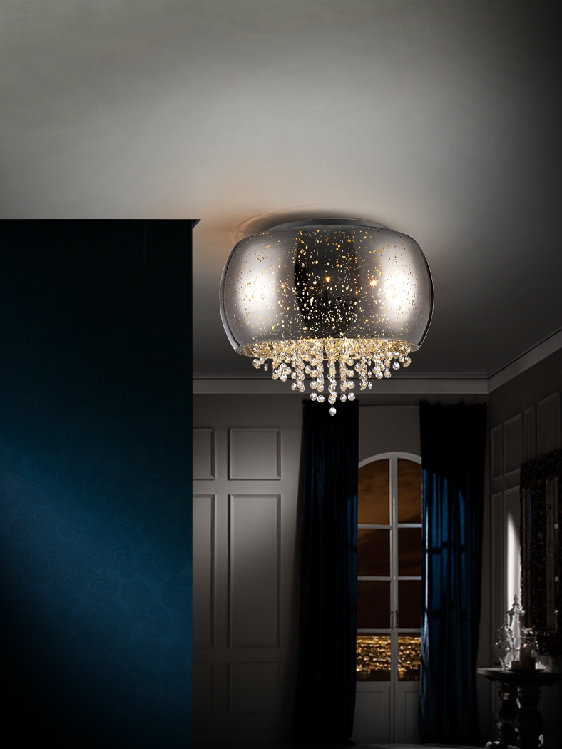 Потолочный светильник из коллекции Caelum от фабрики Schuller с оригинальным плафоном из зеркального стекла с декоративным рисунком "звёздная пыль". Внутри светильника крепятся эффектные стеклянные прозрачные подвески с огранкой. Прекрасный вариант для оформления прихожей в современном интерьере. Купить коллекцию светильников Caelum, в которую входят подвесные люстры, потолочные светильники, настенные бра и настольные лампы медного цвета можно в нашем интернет- магазине по выгодным ценам с оперативной доставкой в Москве. Лампочки: 5 шт. G9 макс.6W.