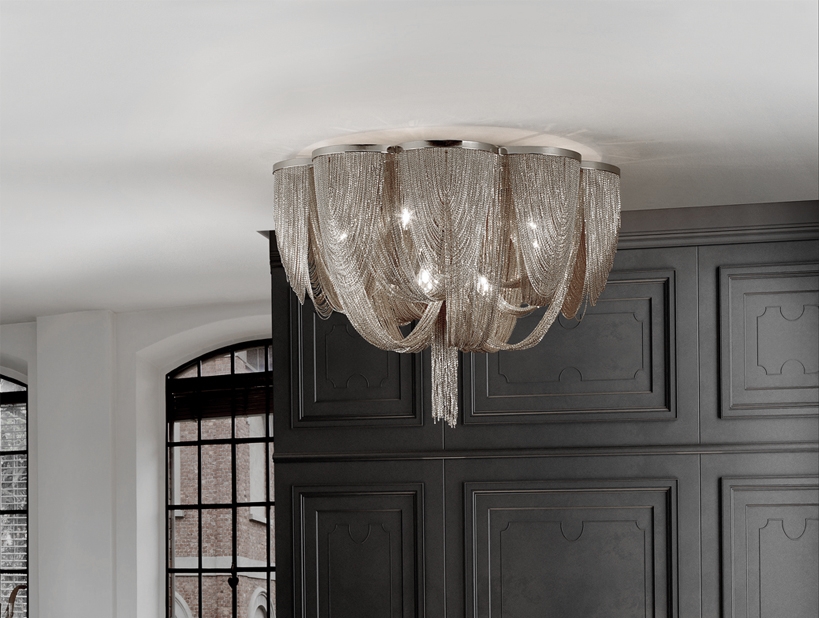 Эффектный потолочный светильник Minerva образован каскадами из тонких металлических цепочек с покрытием "никель", закрепленными на фигурном основании в форме стилизованного цветка. Модель для современных интерьеров. 10 лампочек с цоколем G9 led 6W теплого света 3000К входят в комплект поставки. Максимально- возможная мощность: 10*42 W.