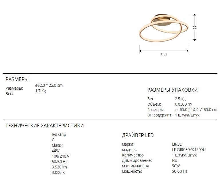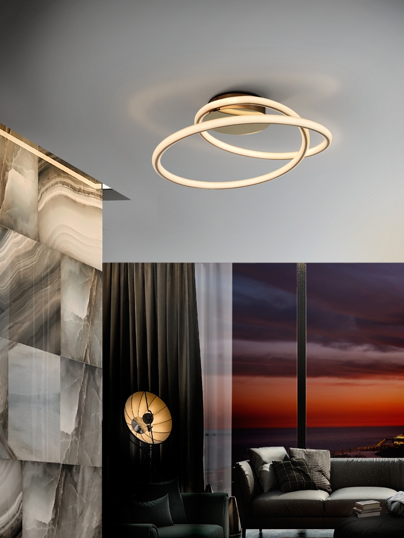 Потолочный светодиодный светильник Tube из металла и алюминия. На потолочной чаше покрытие глянцевое "золото", на абажуре тонкая полоска матового "золота". Рассеиватель трубчатый из силикона опалового цвета. 44W LED, 3520 Lm, теплый свет 3000K. Срок службы рассчитан на 30000 часов.