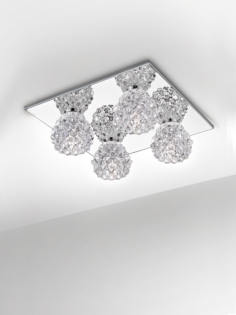 Современный потолочный светильник с четырьмя оригинальными плафонами, похожими на экзотические фрукты из прозрачного стекла, красиво пропускающего свет сквозь многочисленные грани. Основание выполнено из металла в цвете "глянцевый хром".