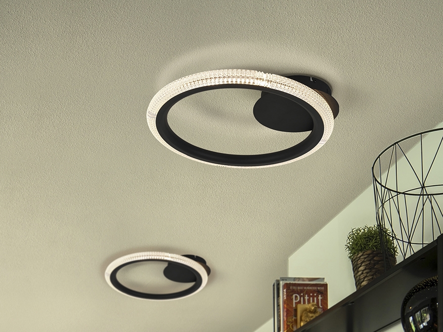 Современный светодиодный светильник- кольцо с чёрной матовой зернистой поверхностью из коллекции Ring диаметром 40 см. Прозрачные акриловые элементы абажура расположены по внешней его стороне. Световой поток 14W Led 893 lm. Тёплый свет 3000 K. Средний срок службы рассчитан на 20 000 часов.