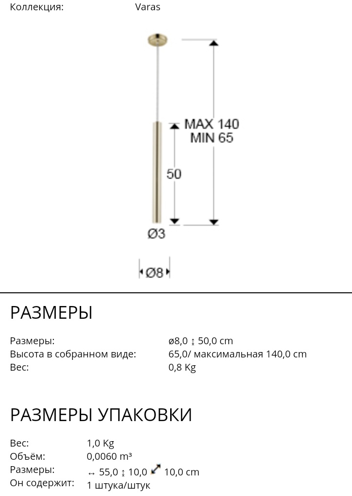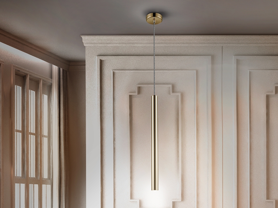 Одиночный LED подвес- цилиндр из новой стильной коллекции Varas фабрики Schuller с корпусом из металла в цвете "глянцевое золото". Акриловый рассеиватель опaлового цвета. Высота подвешивания регулируется по необходимости. Диаметр плафона 3см, высота 50см.