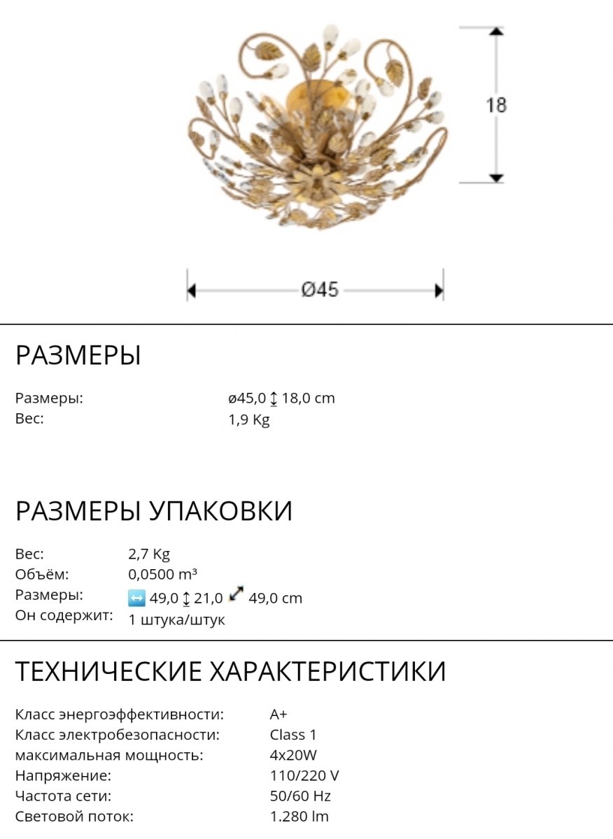 Лампочки: 4шт с цоколем E14 4W led 3000K в комплекте; максимально допустимая мощность: 4x20W led.