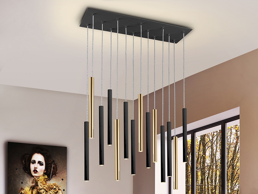 Прямоугольный светодиодный светильник из коллекции Varas c 14 источниками света и пультом управления. Основной цвет отделки матовый черный. В качестве стильных акцентов используются элементы золотого глянцевого цвета. Светодиоды внутри каждого подвеса закрывают акриловые рассеиватели опалового цвета. Длина подвешивания регулируется от 50 см до 140 см. Световой поток: 70W LED, 6300 Lm, теплый свет 3000K. Средний срок службы рассчитан на 50000 часов.