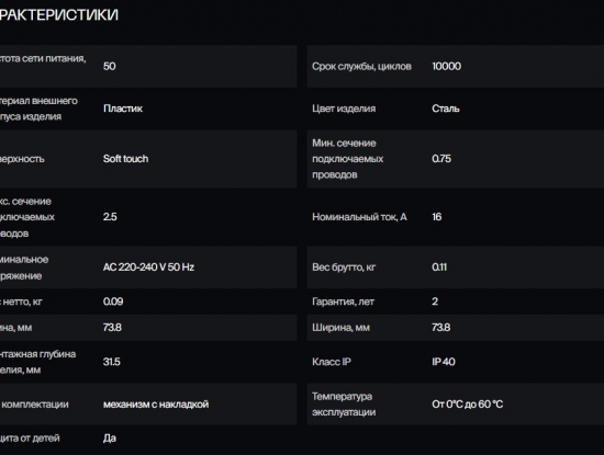 Внешние накладки и корпус выполнены из поликарбоната- долговечного и безопасного материала. Он не разлагается под действием ультрафиолета и выдерживает повышенные температуры, вызванные протекающими токами. Контактные пары выполнены из бронзы, заземляющие контакты- с дополнительным гальваническим покрытием. Бронза обеспечивает высокую безопасность при подключении электроприборов и эффективную бесперебойную передачу тока, сохраняя передаточное усилие, что повышает срок безотказной эксплуатации. Срок службы: 10000 циклов.