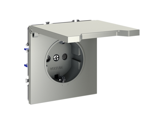 Встраиваемая розетка из серии VOLTUM S70 стального цвета с защитой от детей в виде крышки, с заземлением, защитными шторками, 16А. Тактильно приятная поверхность Soft touch.