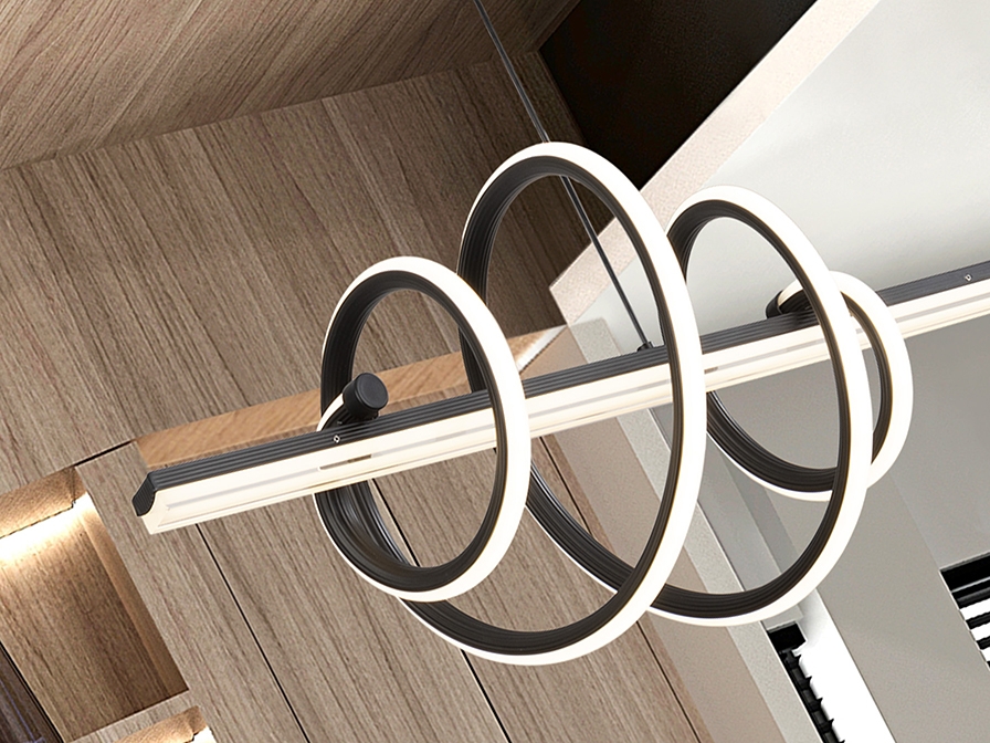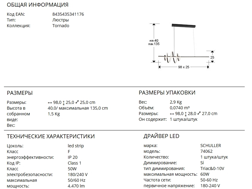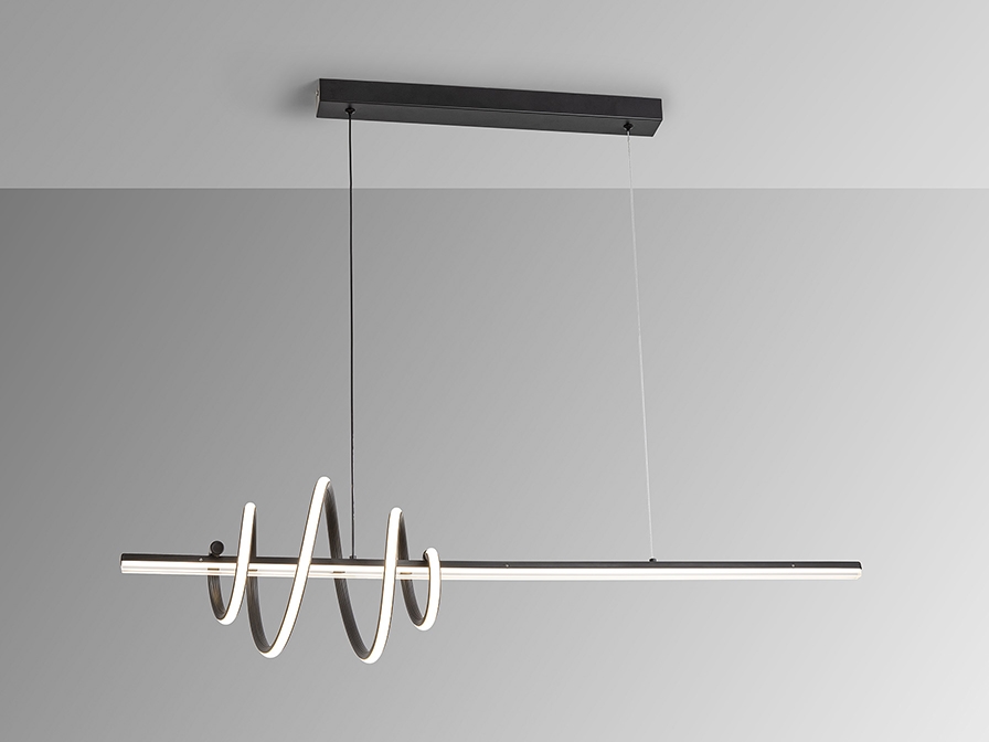 Черный светильник Tornado 693073 внешне похож на закрученную спираль, соответствуя названию "торнадо". Изготовлен из стали и алюминия с матовой отделкой. Рассеиватель на прямой направляющей из акрила, на фигурной- из силикона опалового цвета. Регулируемая высота у всего светильника удобна и для низкой навески над обеденным столом, и для высокой в комнате подростка. Светодиод мощностью 50 Вт, 4470 Lm, 3000 К. В данном изделии используется симисторный светодиодный драйвер с регулировкой яркости от 0 до 10 В. Его можно затемнить с помощью настенного светодиодного диммера с такими функциями.