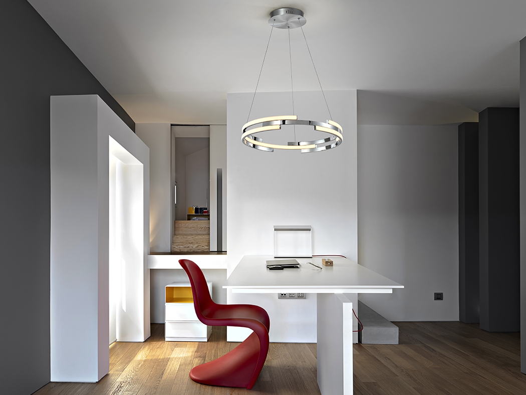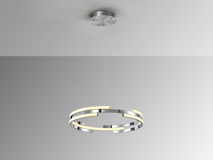 Светильник- обруч Ciclos с хромированной отделкой изготовлен из высококачественных материалов, включая сталь и алюминий, что обеспечивает прочность и легкость модели. Оригинальная форма плафона собрана из радиусных отдельных полос с разным расположением рассеивателя света из силикона опалового цвета. За счёт этого освещение происходит более равномерно, а светильник смотрится современно и стильно. Высота подвешивания от 60 до 120 см. Cветовой поток: 52W LEDs. 3,800lm. 3,000K. Средний срок службы рассчитан на 50000 часов. Данное изделие включает светодиодные драйверы с симистором/ TRIAC и регулировкой яркости 0-10 V, благодаря чему можно отрегулировать яркость с помощью настенного симистора или переключателя яркости 0-10 V. Любой другой тип диммера может повредить светодиодный драйвер.