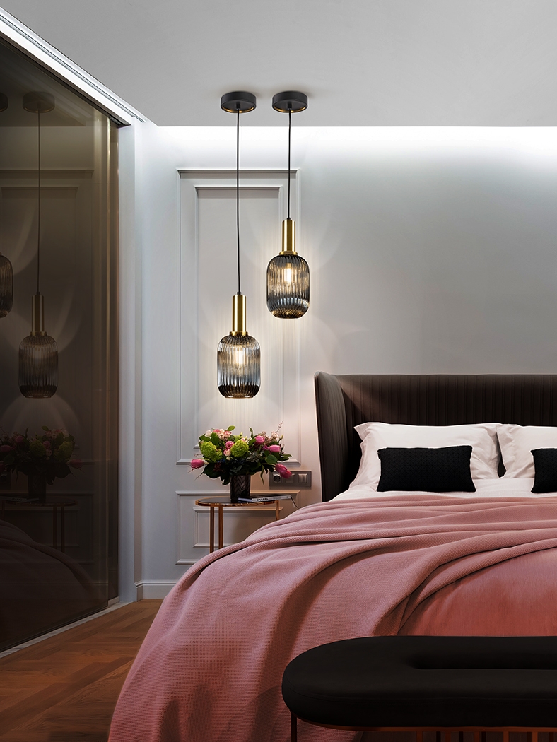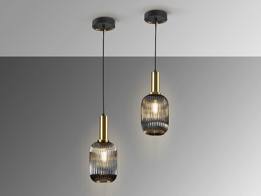 Современный подвес из рифленого зеркально- дымчатого стекла со сменной лампочкой и потолочным основанием матово- черного цвета. Контрастными акцентами у светильника Norma выделены детали в латунном цвете. Высота подвешивания регулируется до 200 см. Диаметр плафона 14 см. Максимально допустимая мощность модели 1х 60 W. *Лампочка 1 шт с цоколем E 27 Led 8 W 3000 K входит в комплект.