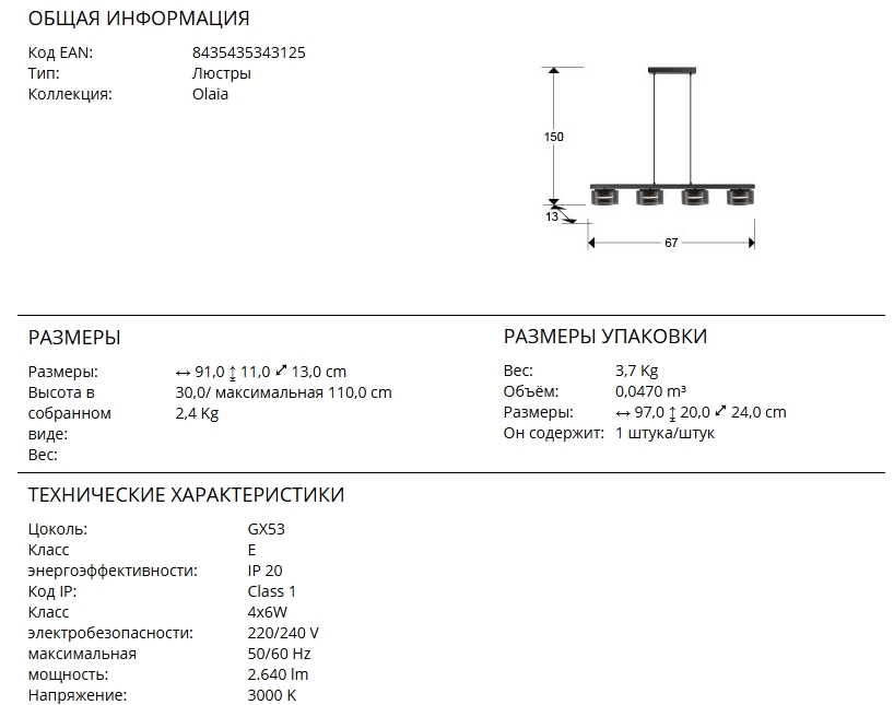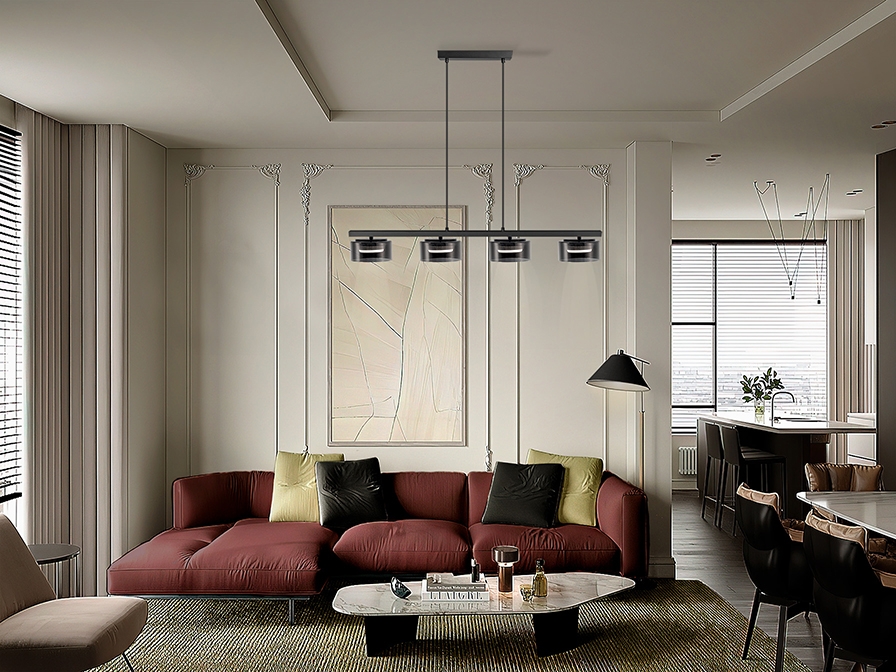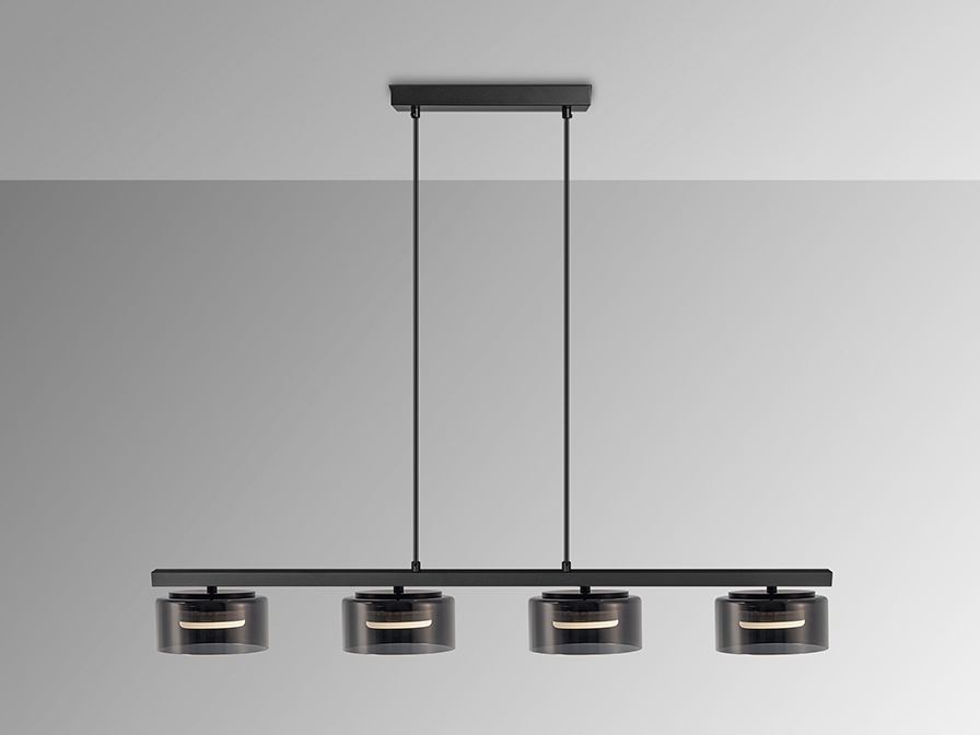 Современный длинный прямой светильник Olaia 12695 полностью в черной отделке. Интересный вариант для оформления пространства над барной стойкой, кухонным островом либо рабочей поверхностью. Длина 91 см. Основание изготовлено из металла с матовой отделкой. Плафоны стеклянные цилиндрические дымчатого цвета диаметром 13 см. Плоские лампочки с цоколем GX53 led теплого света 3000 К поставляются в комплекте. Максимально допустимая мощность люстры: 4x6W led, 2.640 lm.